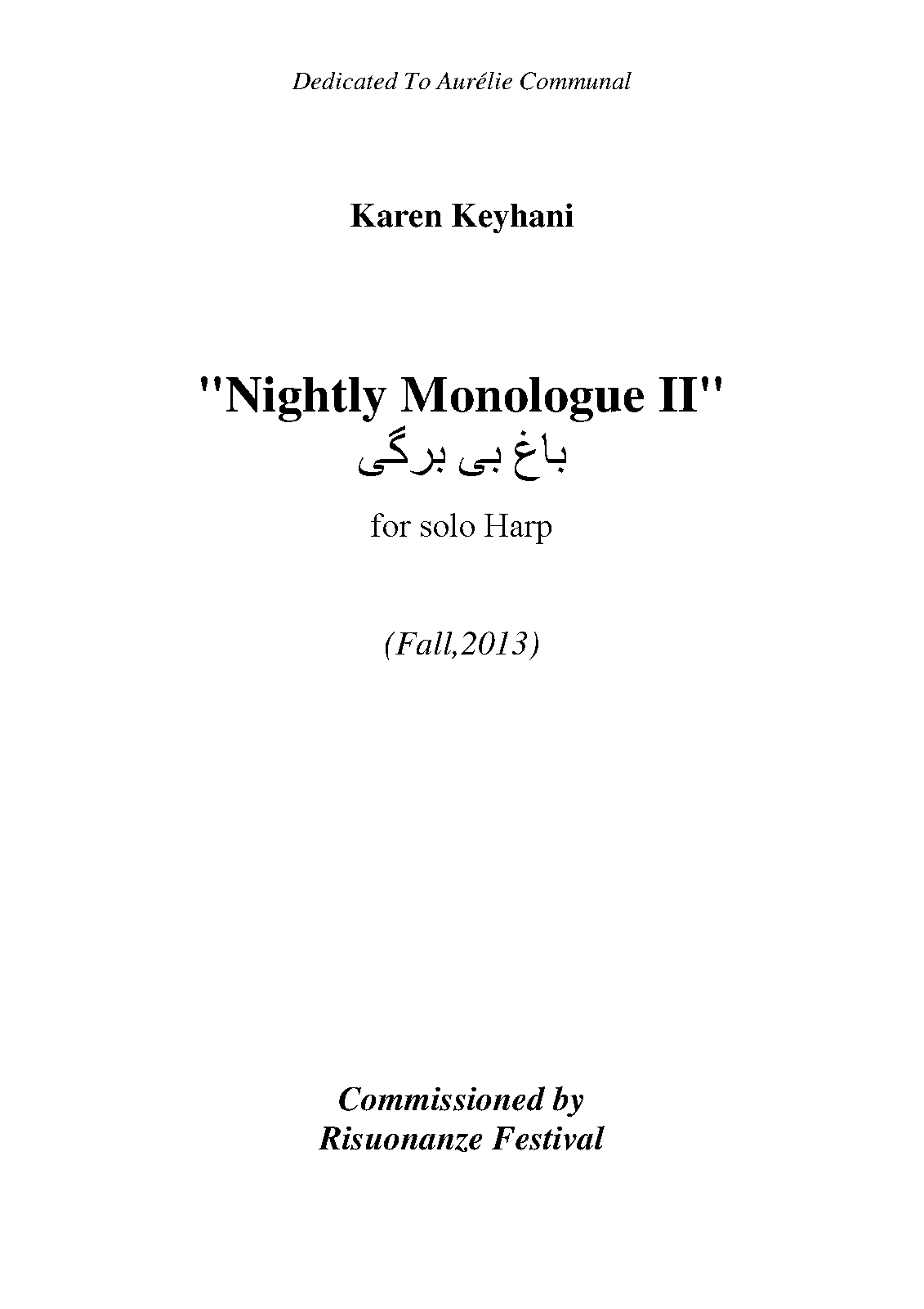 "Nightly Monologue II" (Commissioned by Risuonanze Festival), Composed in EOFA(Embassy Of Foreign Artists), Geneva, November and September 2013, inspired by Persian poet Mehdi Akhavan Sales (1928-1990) in his poem “The Garden Without leaves”. This is the second solo from a five-piece collection titled “Nightly Monologues”.