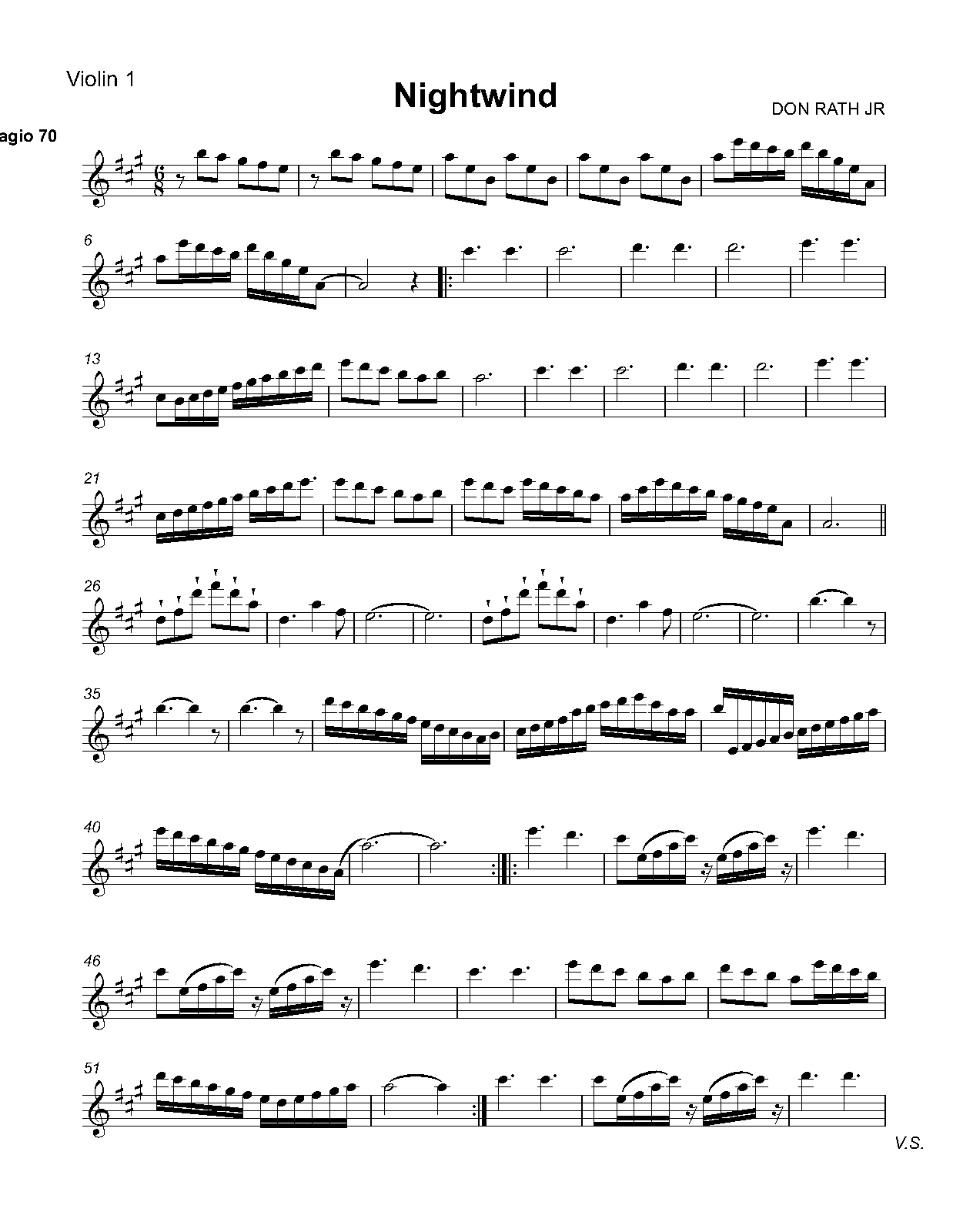 | Extra Information | Maintain a steady 6/8 flow, giving each voice breathing space. The acoustic guitar should sustain resonance, while the classical guitar provides clarity. Violin phrasing should remain expressive, never forceful. Allow natural decay at phrase endings. This file is the Full Score for the composition Nightwind by composer Don Rath Jr |