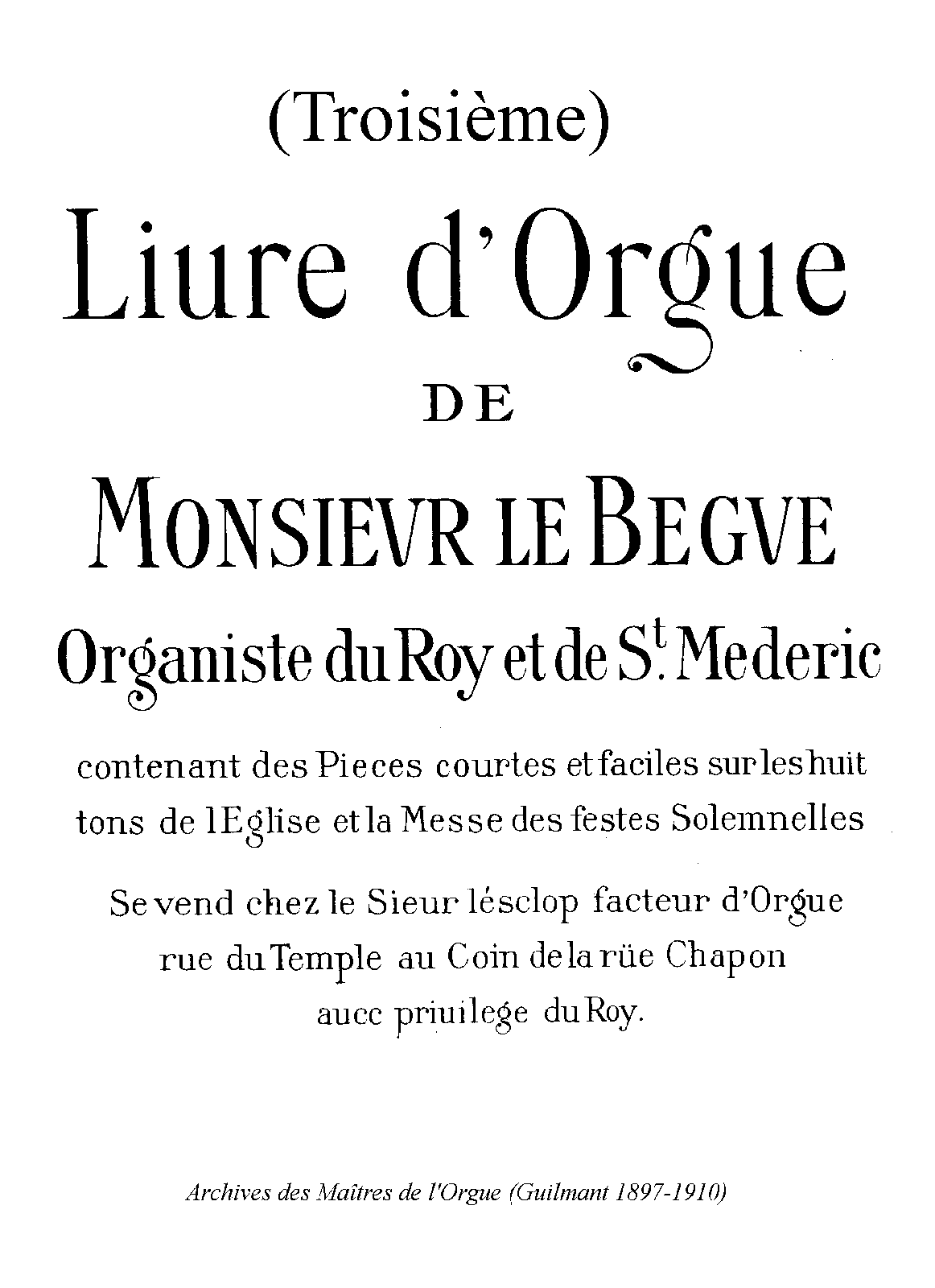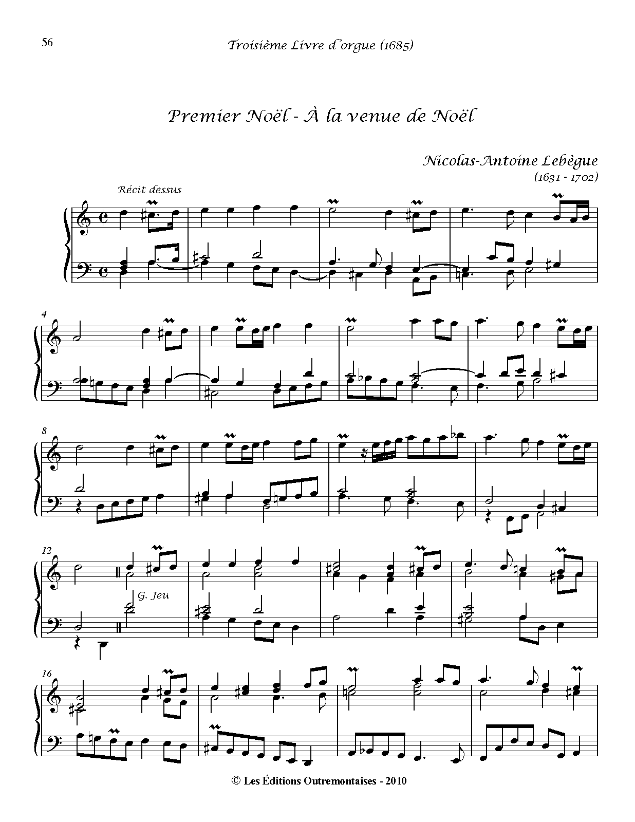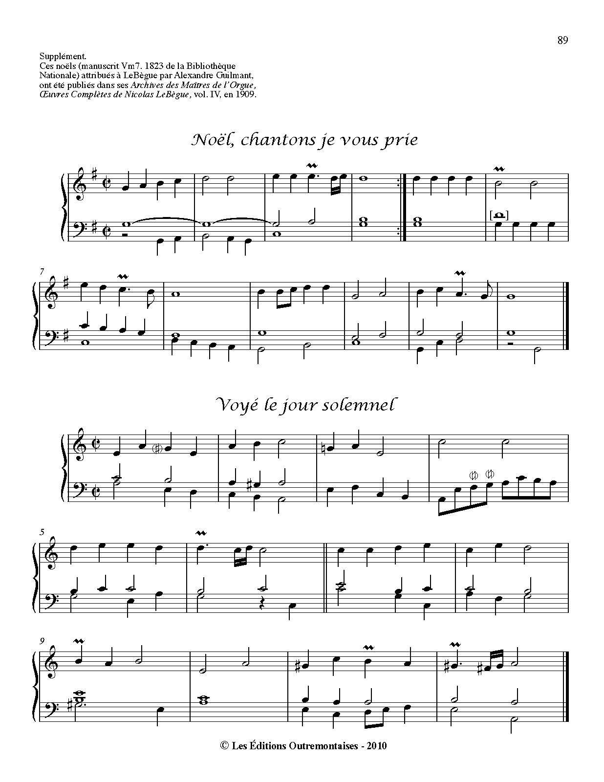 Misc. Notes Addendum. These noëls (ms. Vm7. 1823 in BnF) were attributed to LeBègue, or his pupils, by Alexandre Guilmant, in Archives des Maîtres de l’Orgue, Œuvres Complètes de Nicolas LeBègue, vol. IV (1909).