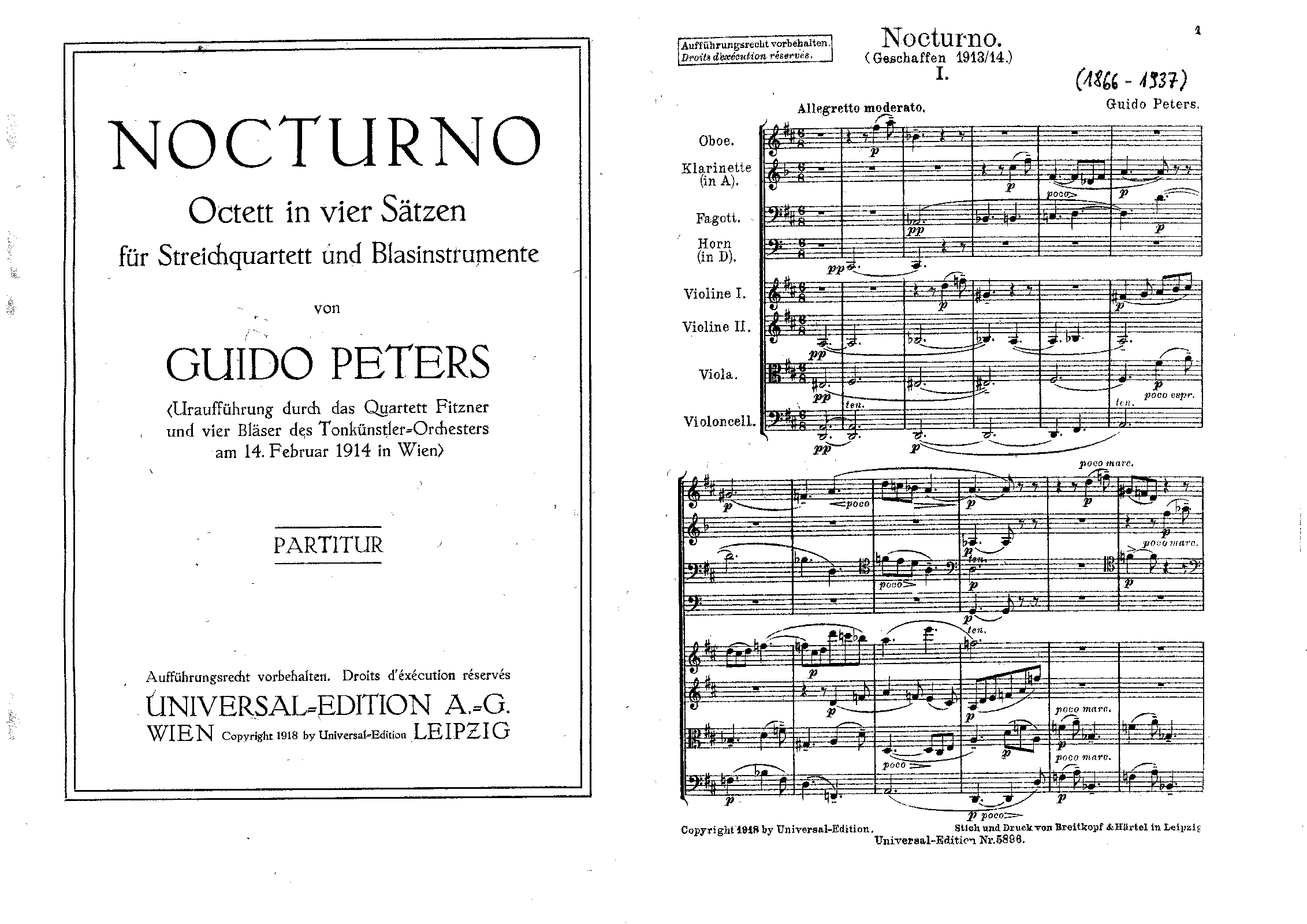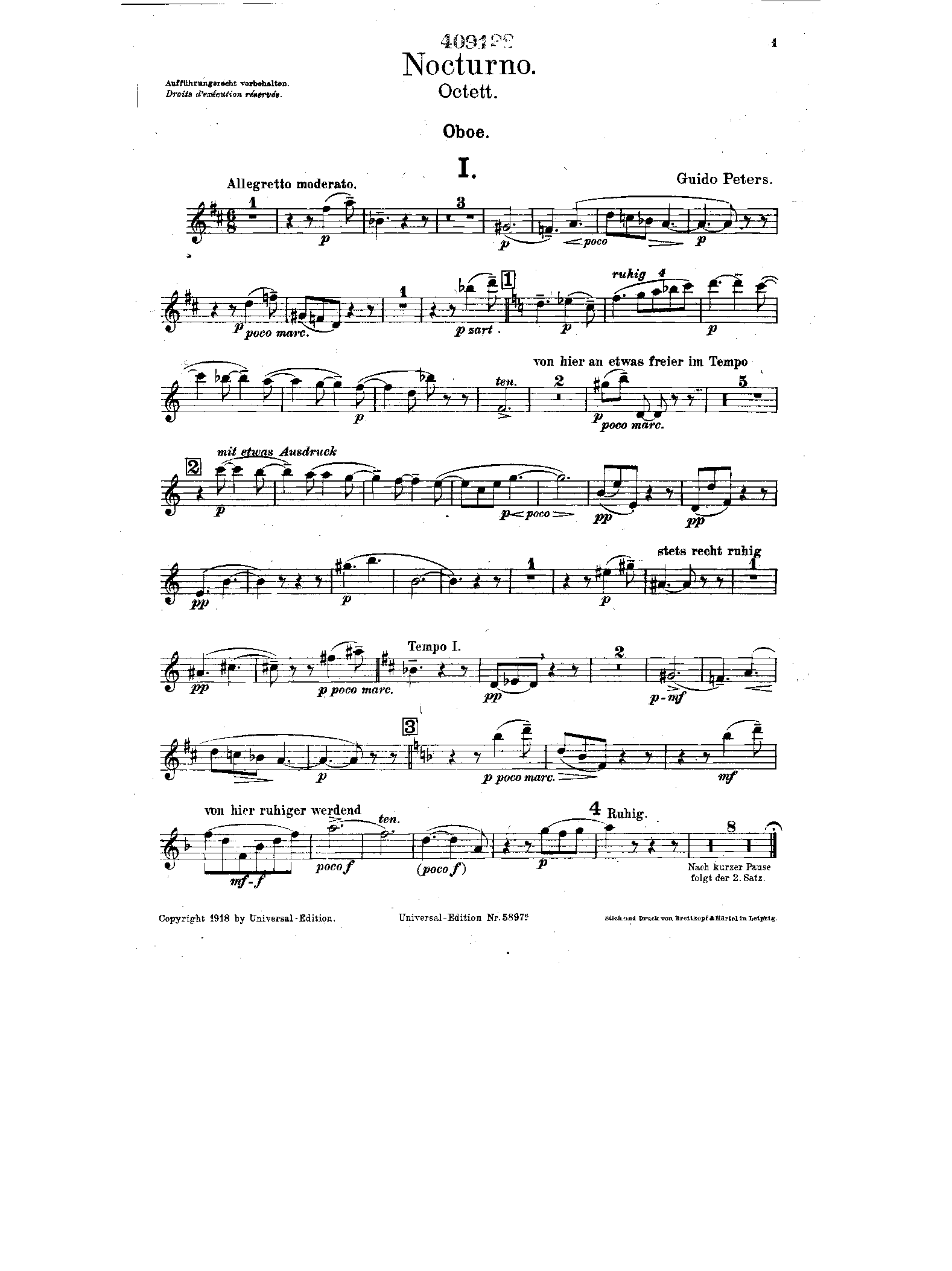 Nocturno. Octett [für] Oboe, Klarinette, Fagott, Horn, Violine I/II, Viola, Violoncell.