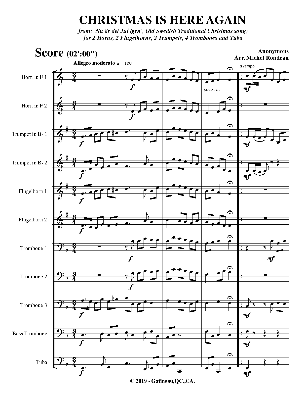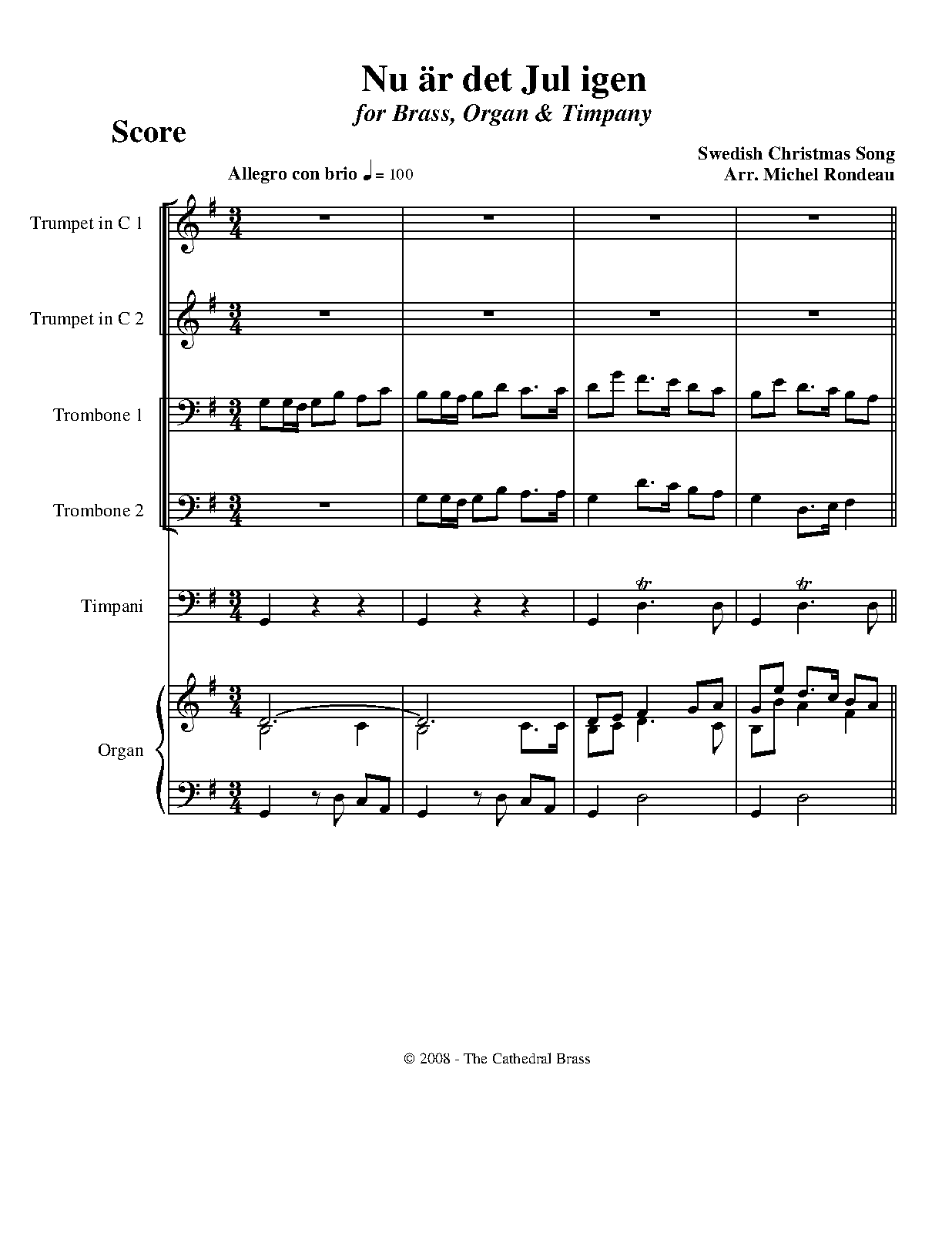 | Genre Categories | Carols; Religious works; For 2 trumpets, 2 trombones, timpani, organ; |