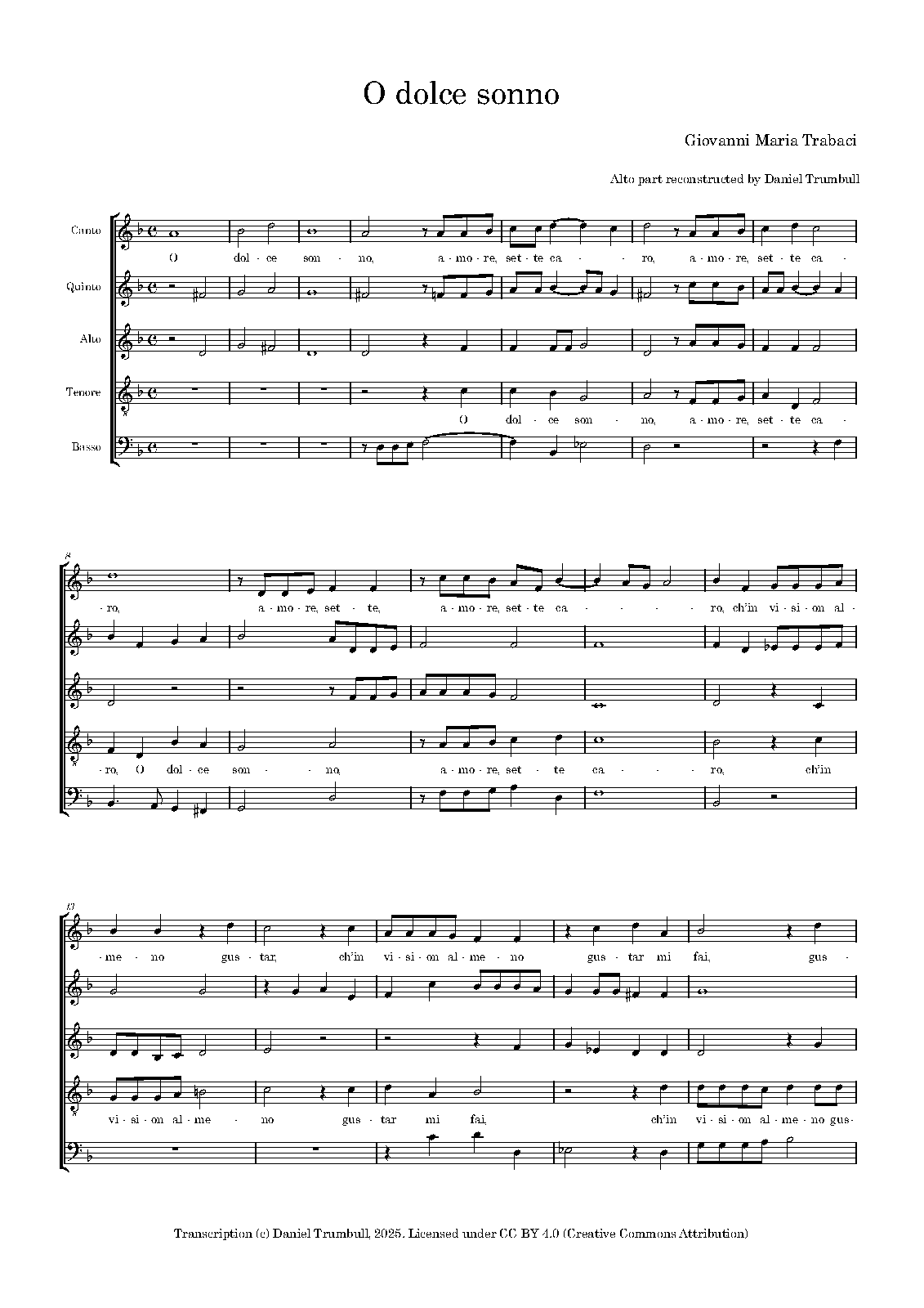 | Extra Information | From Primo Libro di Madrigali, Napoli 1606. Alto part missing in the sources, reconstructed by Daniel Trumbull |