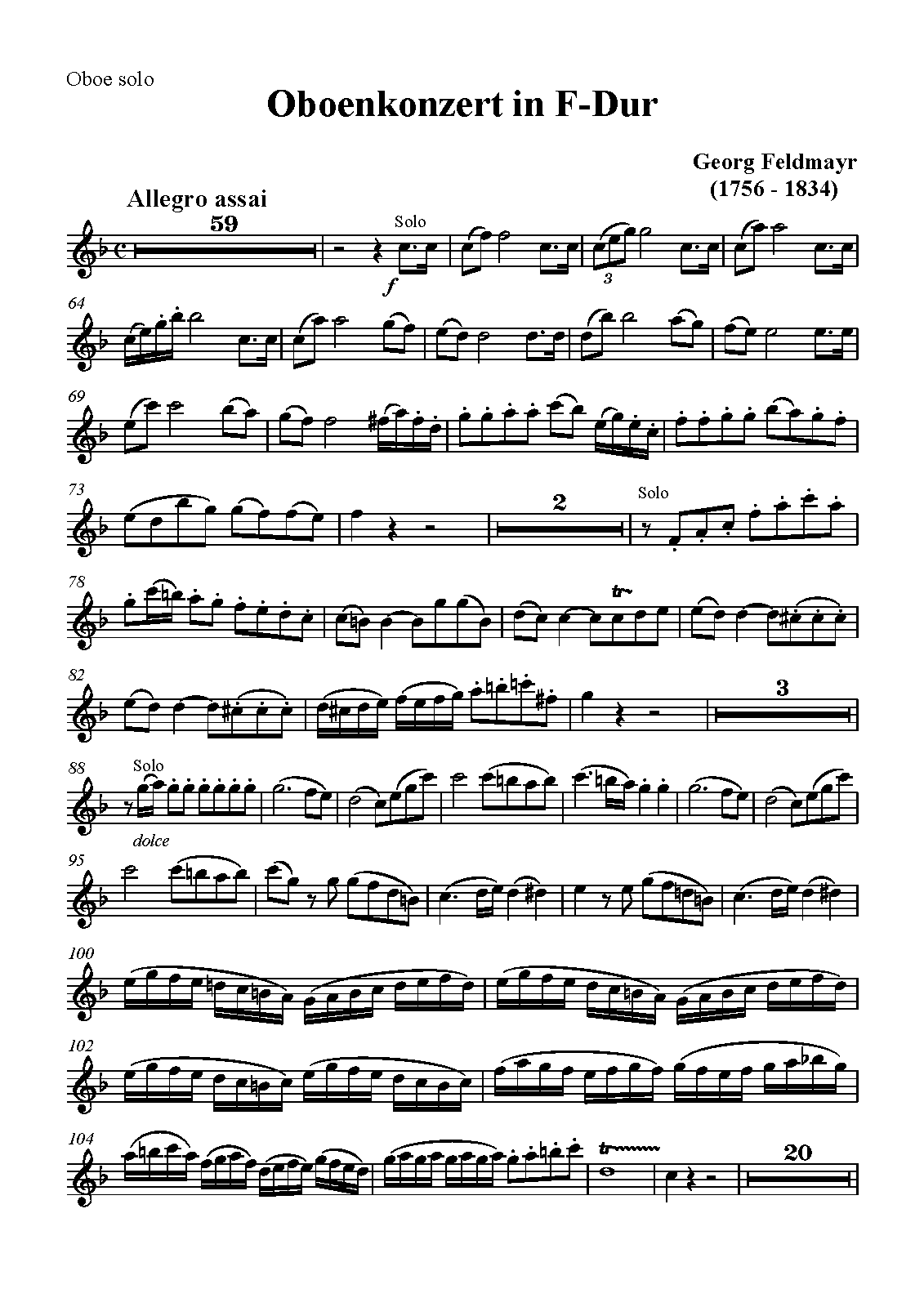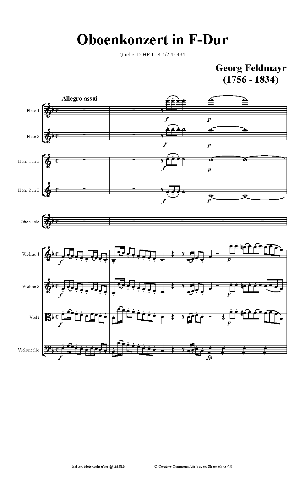 | Extra Information | The present oboe concerto lacks a slow middle movement. Feldmayr presumably drew on Rosetti's clarinet concerto MurR C62 and took a copy of its Romance as the middle movement for his oboe concerto. In this copy, the orchestral instruments on the flyleaf are flutes, as in the other movements of Feldmayr's concerto, while orchestral oboes appear later in the parts, as they were intended for Rosetti's clarinet concerto. You can see this copy of Rosetti´s composition here: [1] |