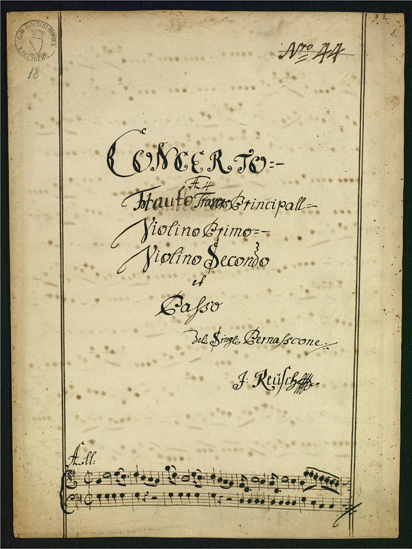 The incipit for this Concerto appeared in Breitkopf's catalogue of 1763 as an Oboe Concerto by Adam. The only survivng source, however is the one above, which attributes the work to Bernasconi and ascribes the solo part to the flute. Oboe is probably the original instrument, as in this manuscript, Hautbois has been crossed out and replaced with Flauto Traverso.