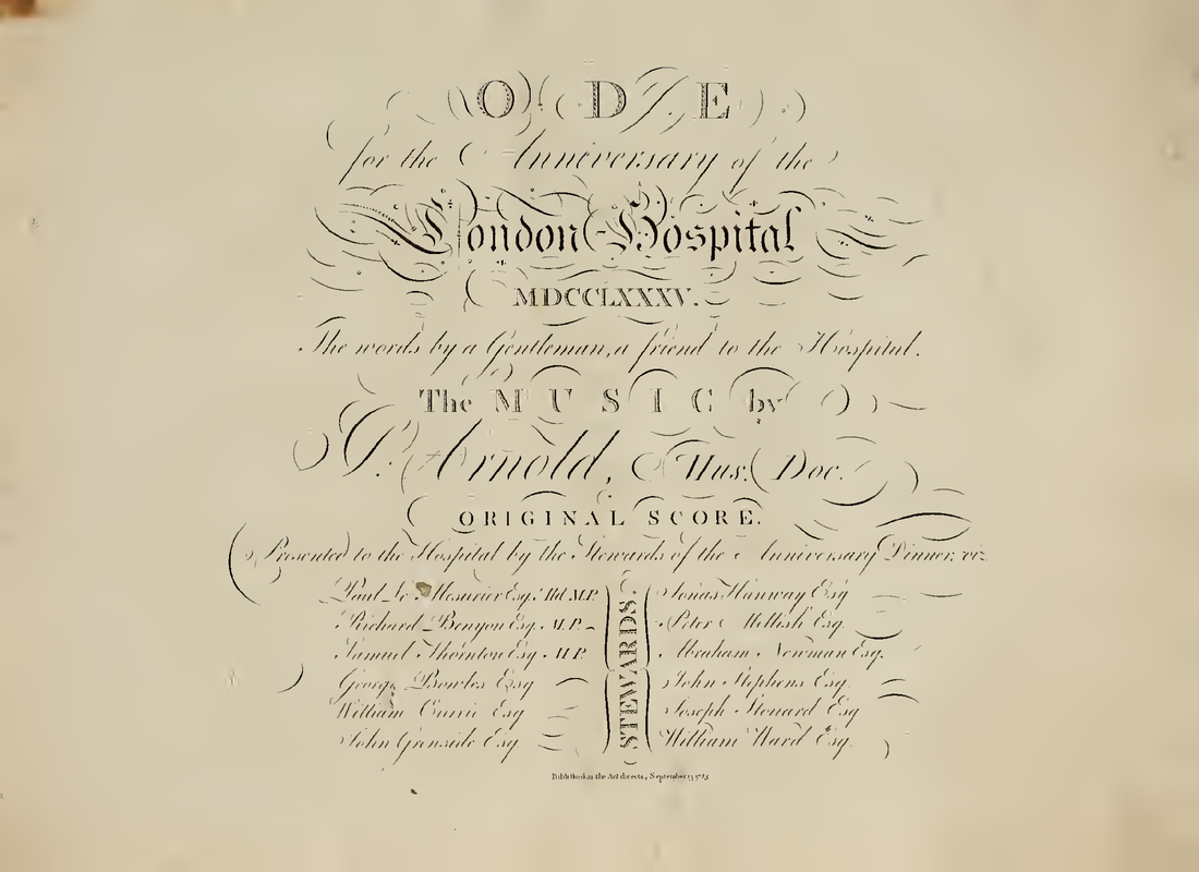 - Ode for the Anniversary of the London Hospital MDCCLXXXV. The words by a Gentleman, a friend to the Hospital. The Music by S. Arnold, Mus. Doc. Original Score. Presented to the Hospital by the Stewards of the Anniversary Dinner</span>