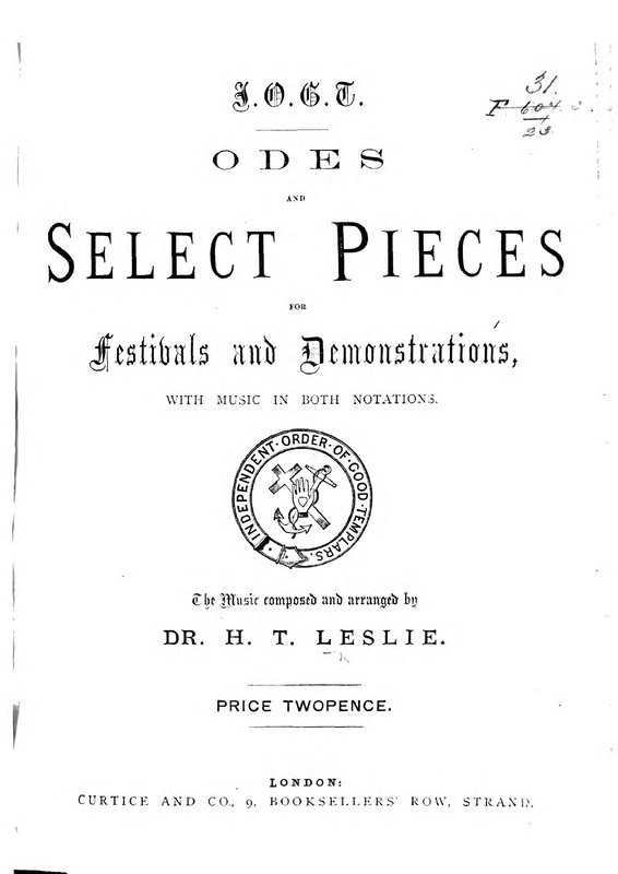 I. O. G. T. Odes and Select Pieces for Festivals and Demonstrations, with music in both notations. The Music composed and arranged by Dr. H. T. Leslie