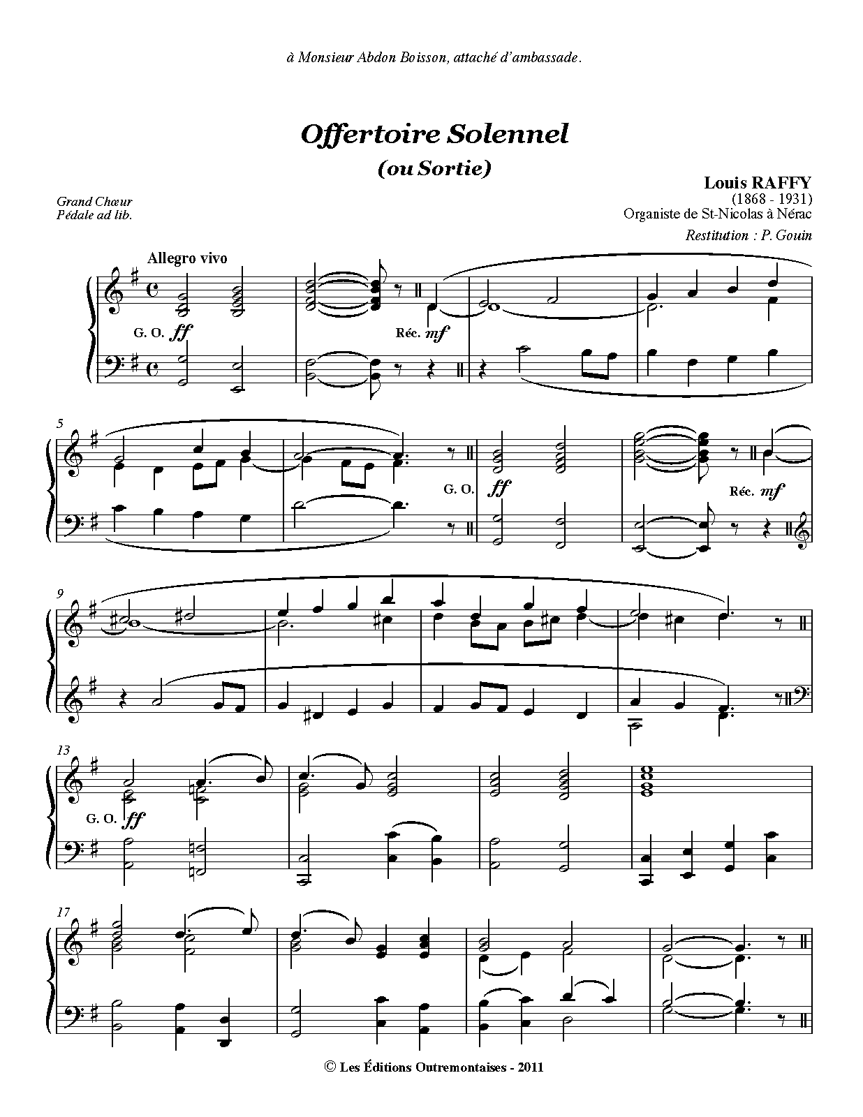 Nota bene. A slightly revised version (more elaborate ending) was later published as No.7 in 10 Pièces pour Orgue ou Harmonium Op. 62, in 1912.