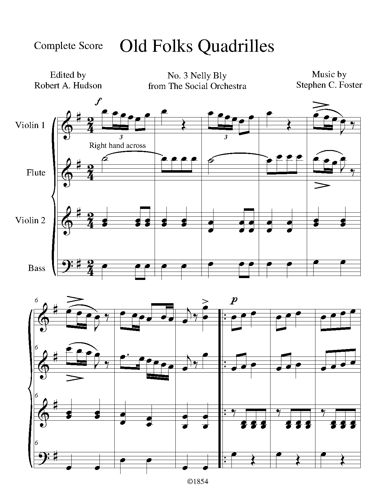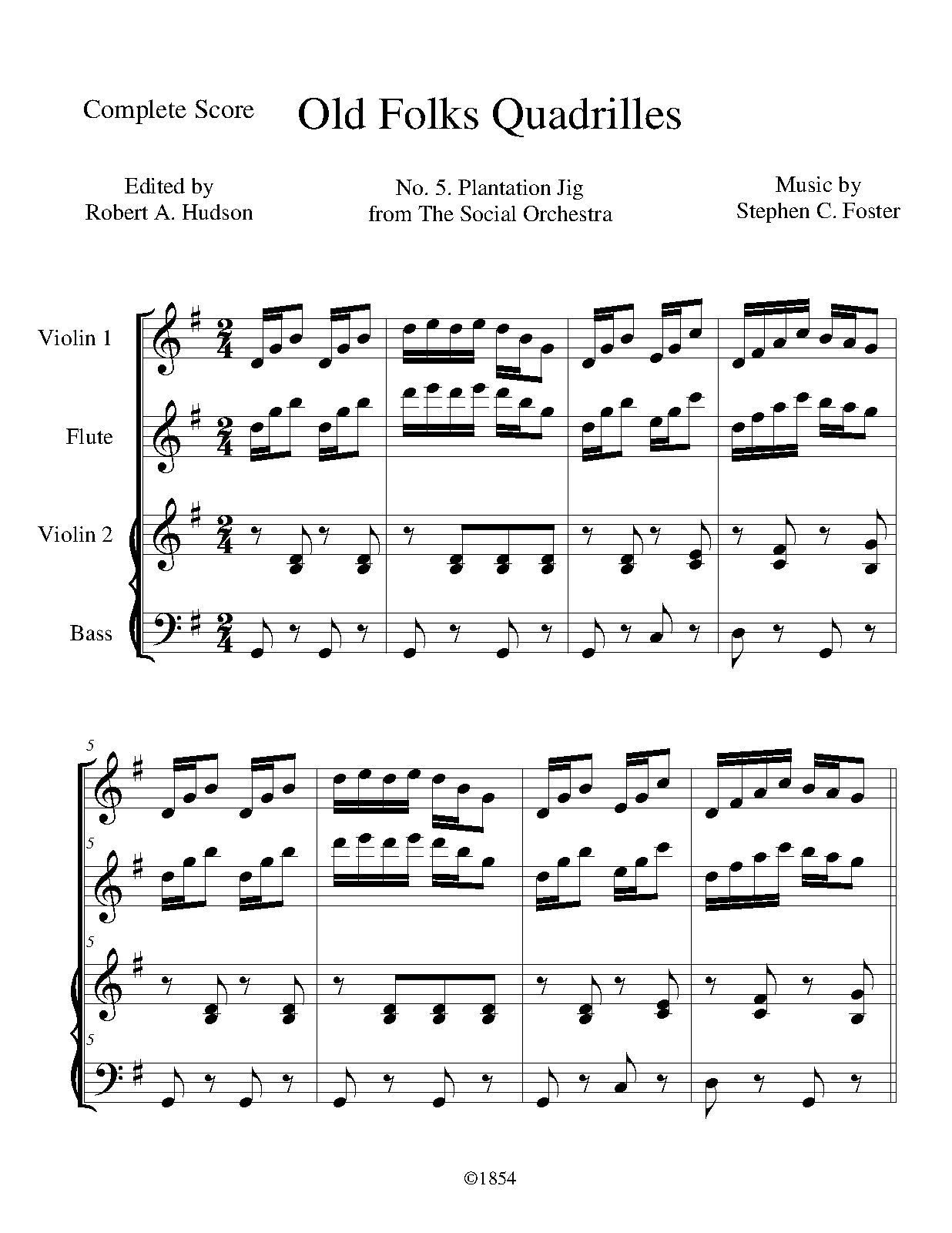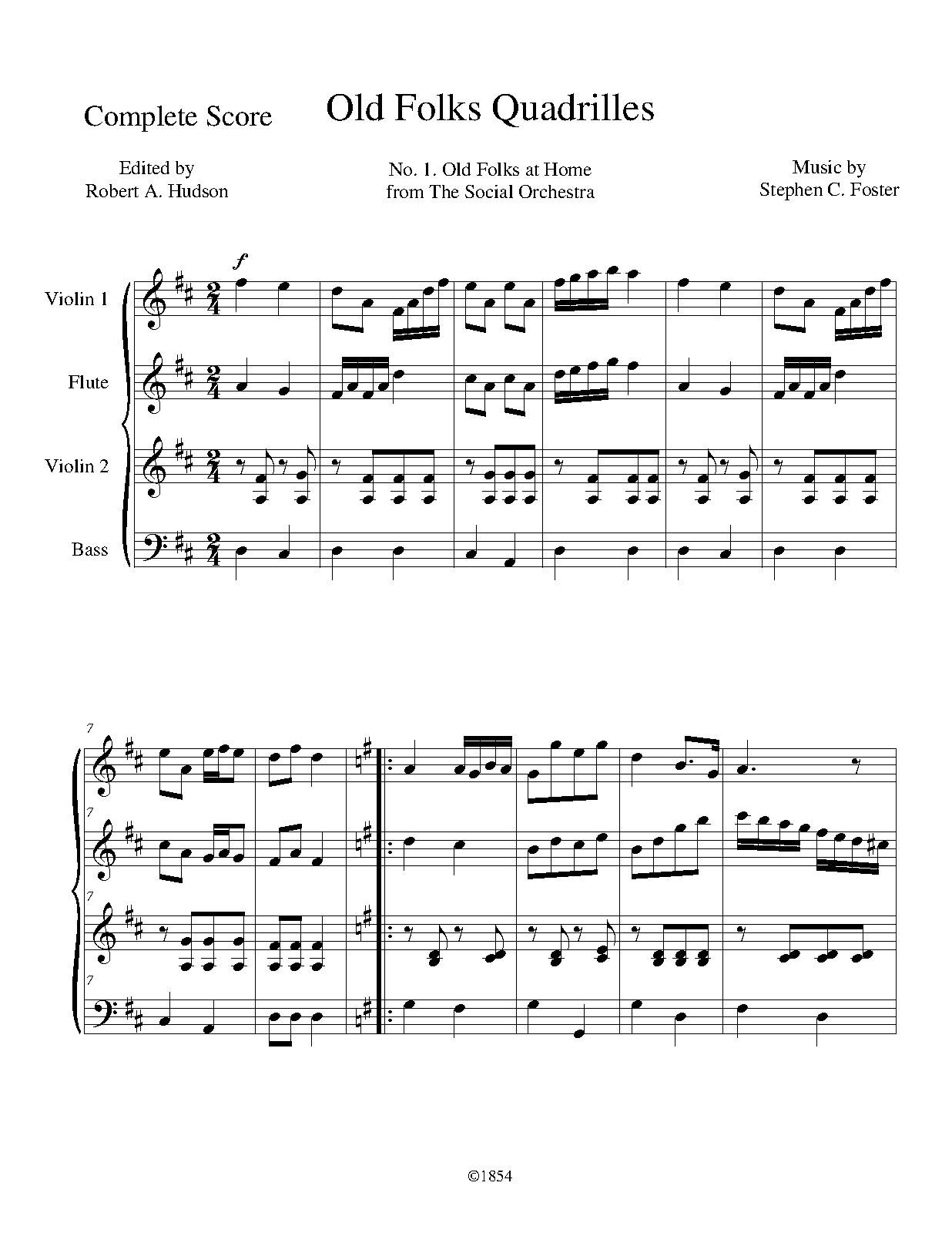 The other piece of music called "Quadrilles" contains the same tunes as this one. "Quadrilles" was published well after Foster's death and is arranged for piano. "Old Folks Quadrilles" was arranged by Foster for The Social Orchestra.