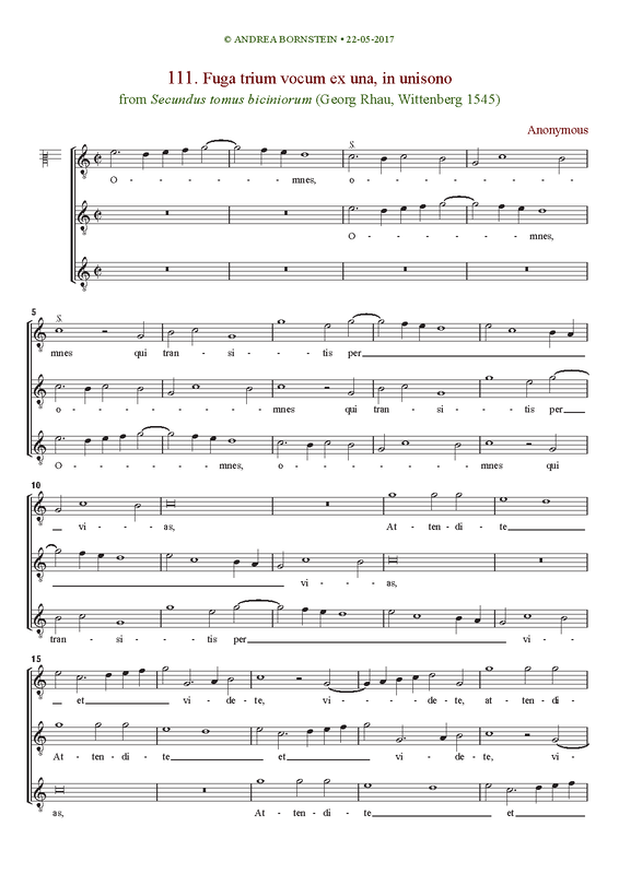| Alternative. Title | fuga trium vocum ex una, in unisono |