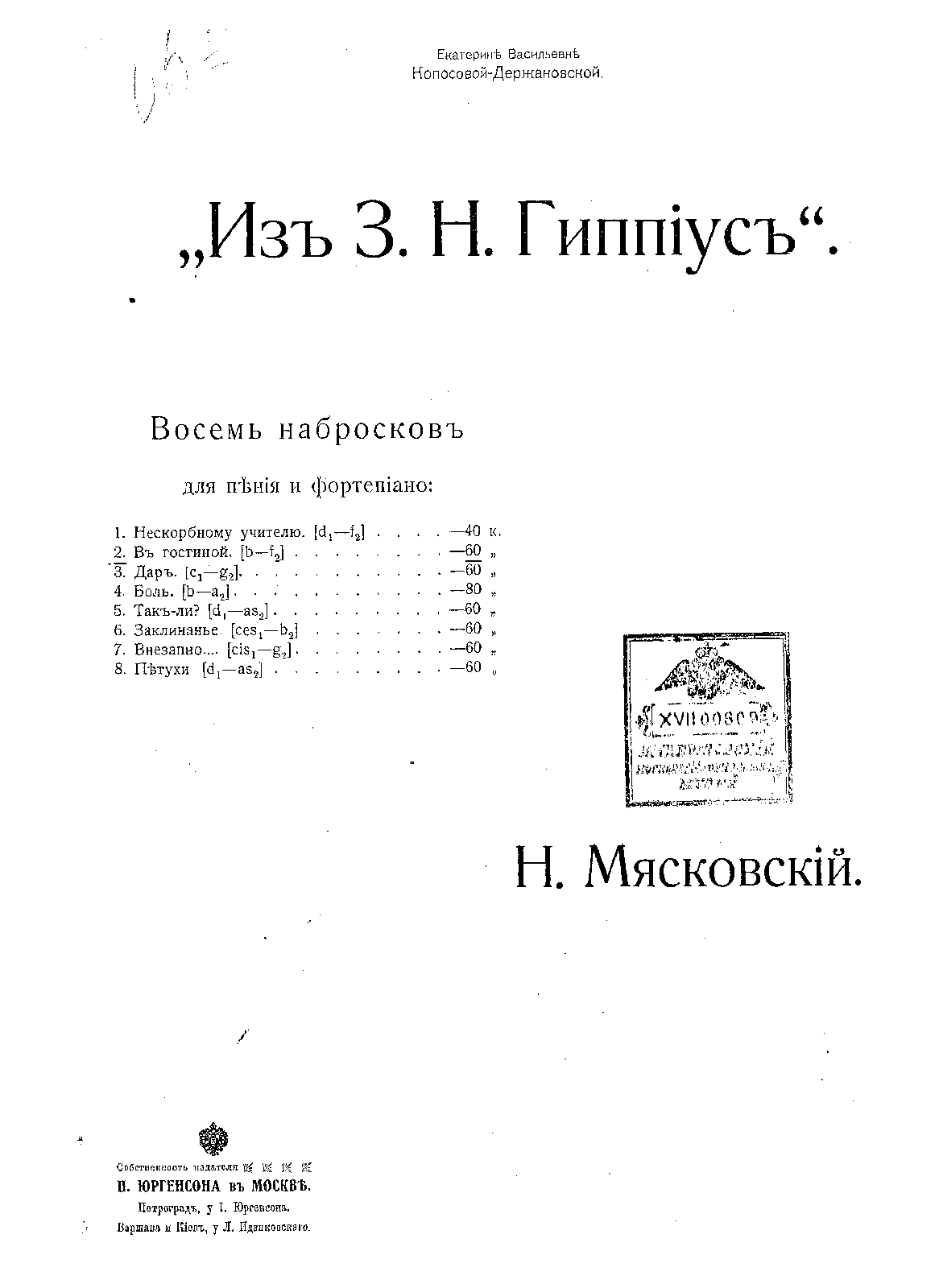 | First Publication. | 1914 (Nos.3, 13, 16-17) - Moscow: P. Jurgenson 1922 (Nos.1-2, 5-8, 10, 14-15) - Moscow: Muzgiz |