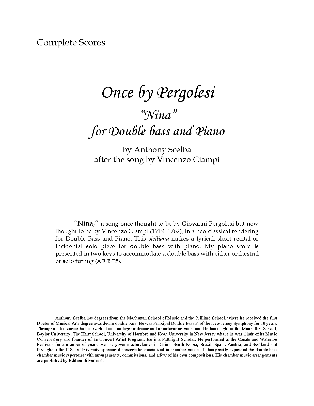 | Extra Information | Nina, a song once thought to be by Giovanni Pergolesi but now thought to be by Vincenzo Ciampi (1719–1762), in a neo-classical rendering for Double Bass and Piano. This siciliana makes a lyrical, recital or demonstration piece for double bass with piano. My piano score is presented in two keys to accommodate a double bass with either orchestral or solo tuning (A-E-B-F#). |