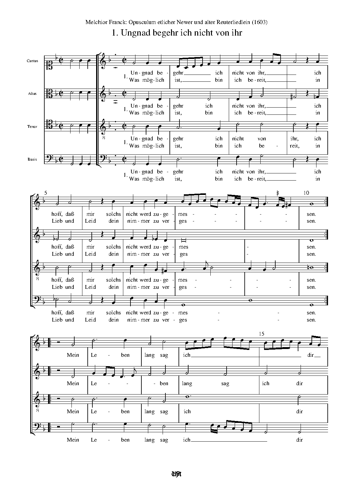 ⇒ 29 more: 2. Ach Winter kalt • 3. Wiewohl ich arm und elend bin • 4. Ich will zu Land ausreiten • 5. Ich bin zu lang gewesen • 6. Beschaffens Glück • 7. Ich hört ein Fräulein klagen • 8. Ach Mutter, liebste Mutter mein • 9-10. Jungfrau, sag mir, wie g'fall ich dir / Was fragst du mich • 11. Ich schall mein Horn ins Jammertal • 12. Papiers Natur ist Rauschen • 13. Ich ritt mir aus Kurzweilen • 14. Ich hab's gewagt frisch unverzagt • 15. Brauns Mägdelein • 16. Mein Feinslieb ist zu aller Frist • 17. Mich wundert zwar • 18. Ich ging vor ein'r Frau Wirtin Haus • 19. Der Reif und auch der kalte Schnee • 20. Vinum quae pars (original key) • 20. Vinum quae pars (transposed down a fourth) • 21-22. Sprich nicht, schöns Lieb / Ein Wort von dir (original key) • 21-22. Sprich nicht, schöns Lieb / Ein Wort von dir (transposed down a fourth) • 23. Wo soll ich mich hinkehren (original key) • 23. Wo soll ich mich hinkehren (transposed down a fifth) • 24. Ich ritt einmal zu Braunschweig aus (original key) • 24. Ich ritt einmal zu Braunschweig aus (transposed down a fifth) • 25. Von deinetwegen bin ich hier • 26. Wilhelmus von Nassaue • 27. Traut Hänslein • 28. Mir g'liebt und schwebt im Herzen mein / 29. O sing und spring; 30. Re sol singt all