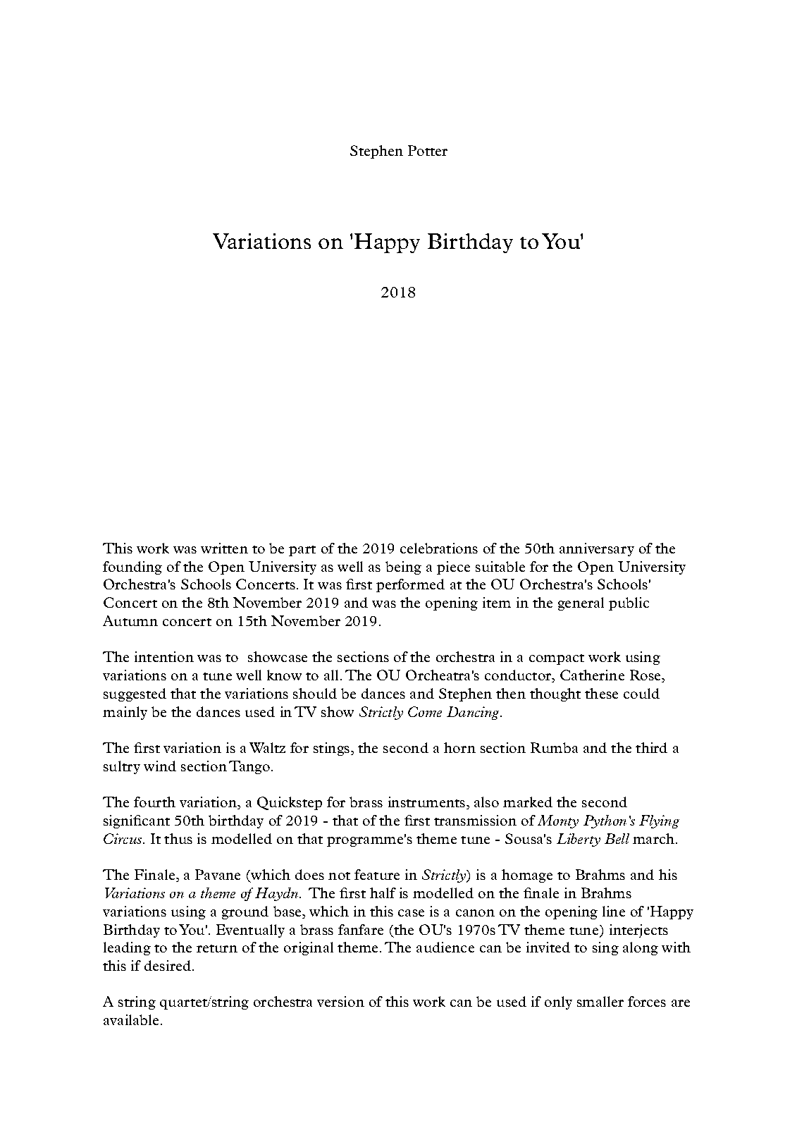 | Work Title | Orchestral Variations on 'Happy Birthday to You' |