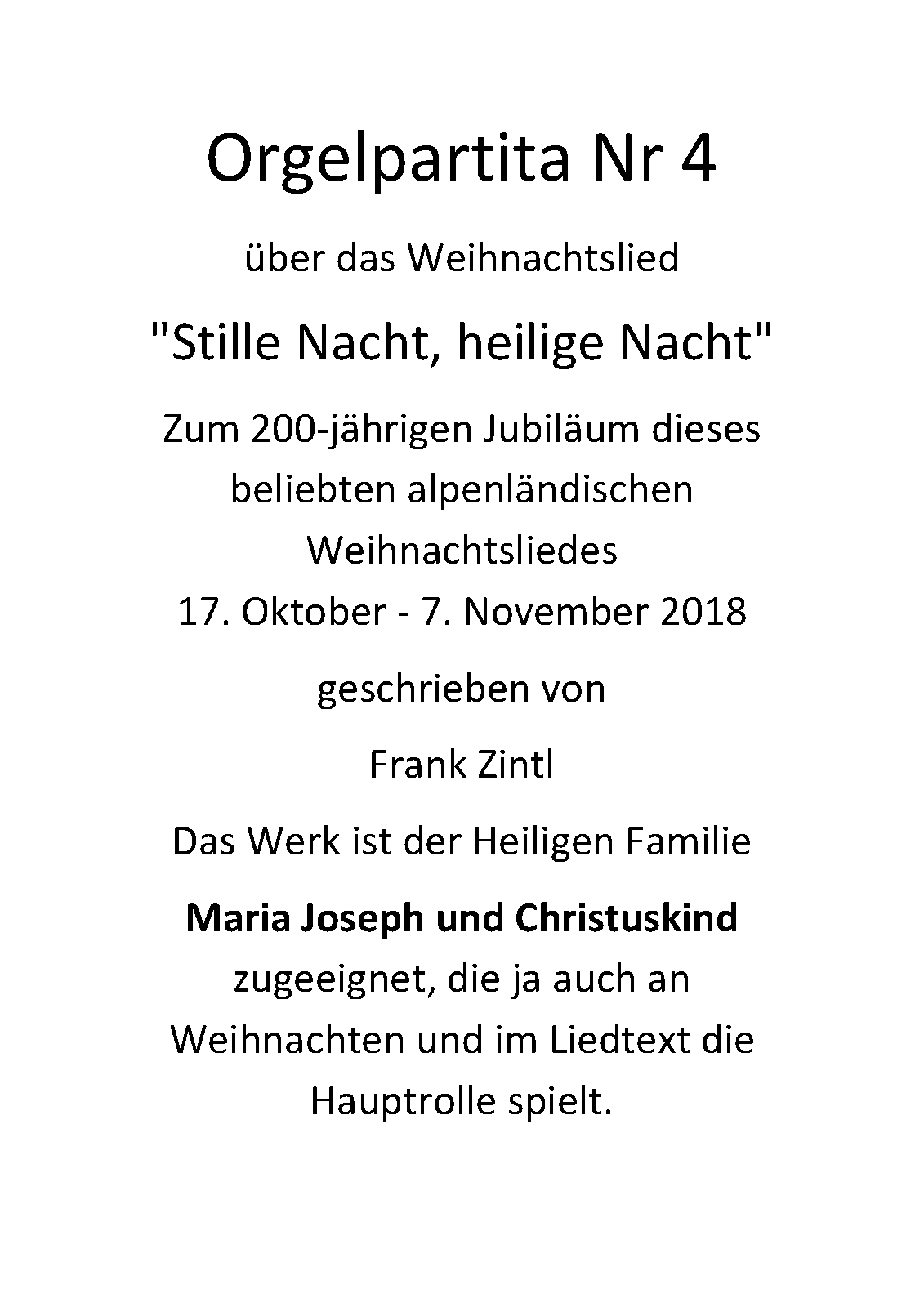 This piece wants to contribute to the celebration of 200 years of the famous Austrian Christmas Carol Silent Night, which was written on Christmas Eve in 1818 in the little village Oberndorf near by Salzburg in Austria. The Partita consists of 5 movements. Performers are free to choose and to perform this Partita as a whole, or single movements as single pieces, as they wish.