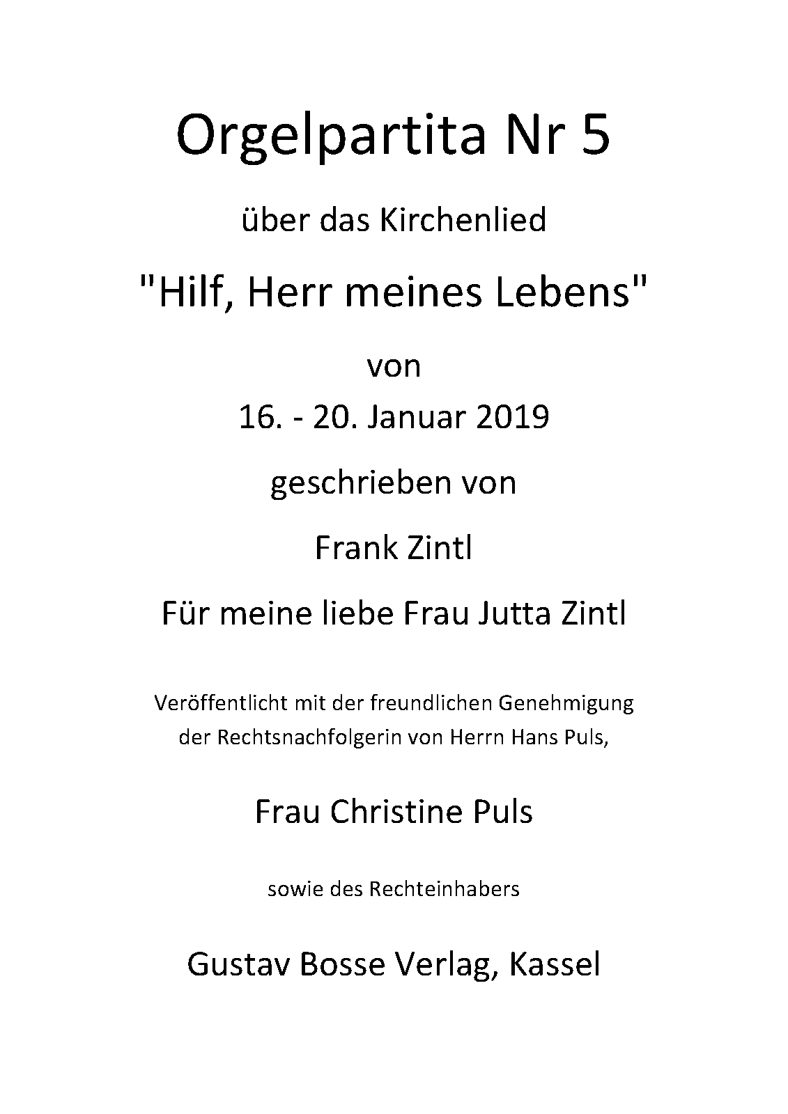 The basic melody of this organ work is still under copyright protection. It was written by Hans Puls in 1962. The publisher who owns the rights to this melody, Gustav Bosse Verlag in Kassel, Germany, has kindly granted me the right to use it in this new organ work and to publish my organ work here on IMSLP.