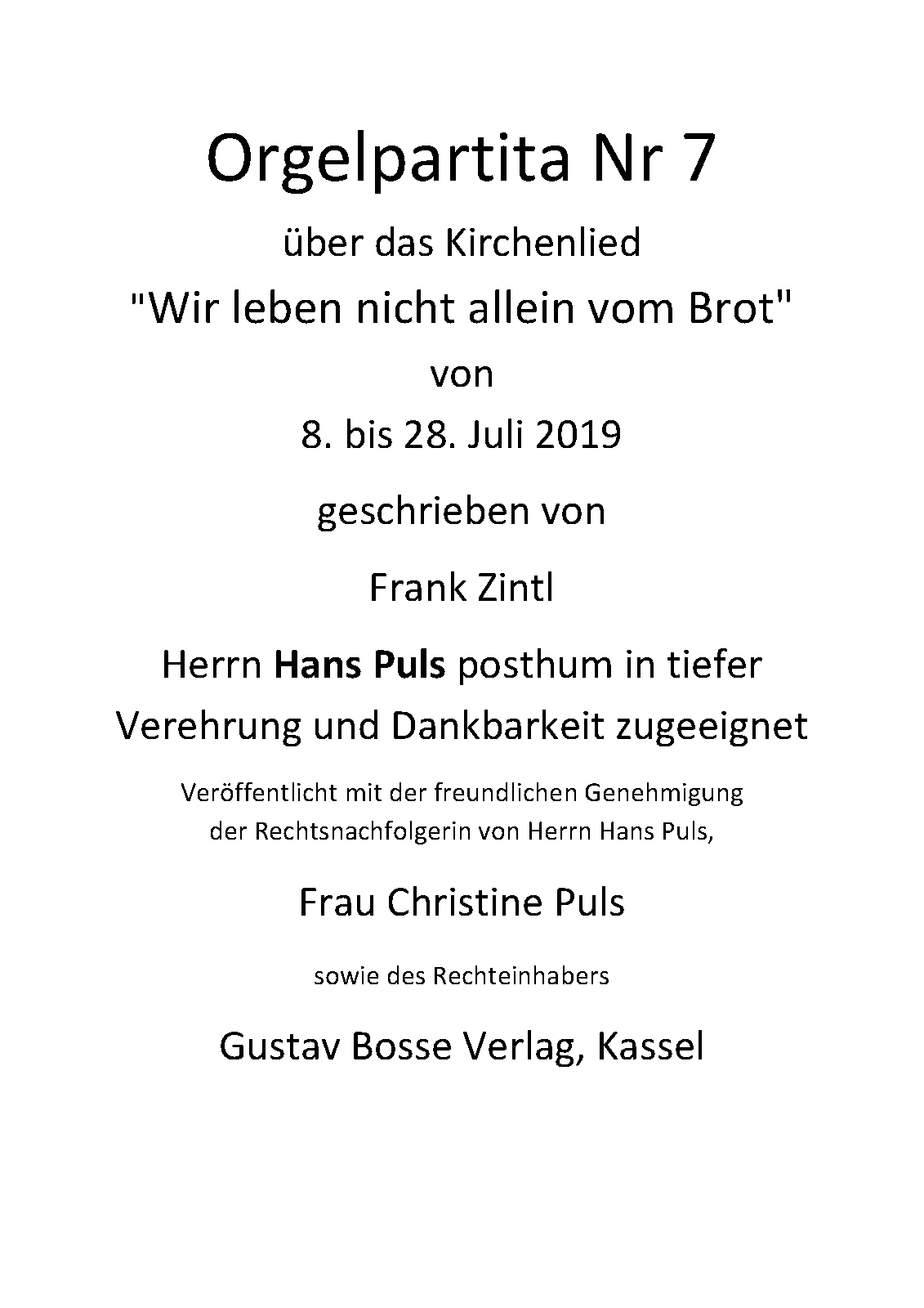 The basic melody of this organ work is still under copyright protection. It was written by Hans Puls beore 1968. The publisher who owns the rights to this melody, Gustav Bosse Verlag in Kassel, Germany, has kindly granted me the right to use it in this new organ work and to publish my organ work here on IMSLP.