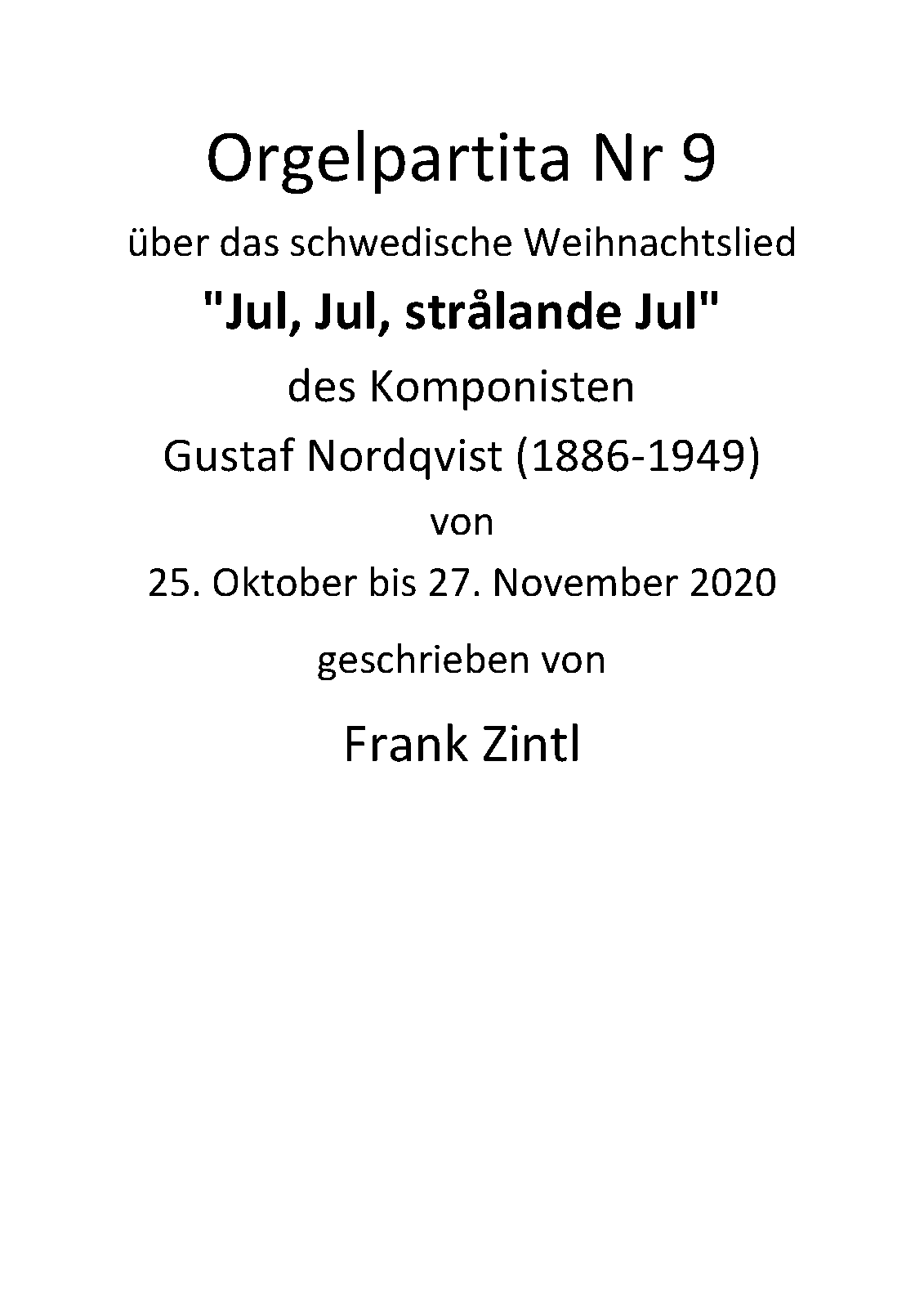 This organ partita is based on the traditional Swedish Christmas song 'Jul, Jul, strålande Jul.' Ths christmas song was written by Gustaf Nordqvist (1886-1848) in 1920. Since the author passed away for 71 (!) years ago, now his song is free from copyright limitations. Thus I am fre to publish this organ work without the need of any permission. My work is for free use. All organ players are welcome to play, perforn and reccord it if they like.