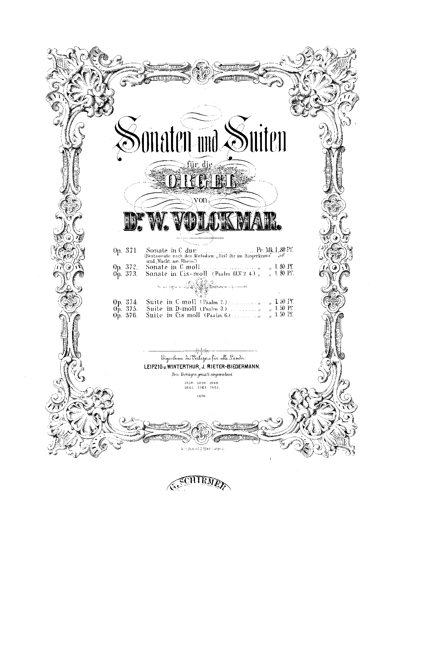 Sonaten u. Suiten f. Orgel. Leipzig, Rieter-Biedermann. Op. 371. Sonate (C). Festsonate nach den Melodien: „Heil Dir im Siegerkranz“ u. „Wacht am Rhein“. Mk 1,80. – 372. Sonate (Cm.). Mk 1,80. – 373. Sonate (Cism.). (Psalm 61. V. 2–4). Mk 1,80. – 374. Suite (Cm.) (Psalm 2). Mk 1,50. – 375. Suite (Dm.) (Psalm 3). Mk 1,50. – 376. Suite (Cism.) (Psalm 6). Mk 1,50. - October 1879, page 305. (Mk is of course the price in Marks.)