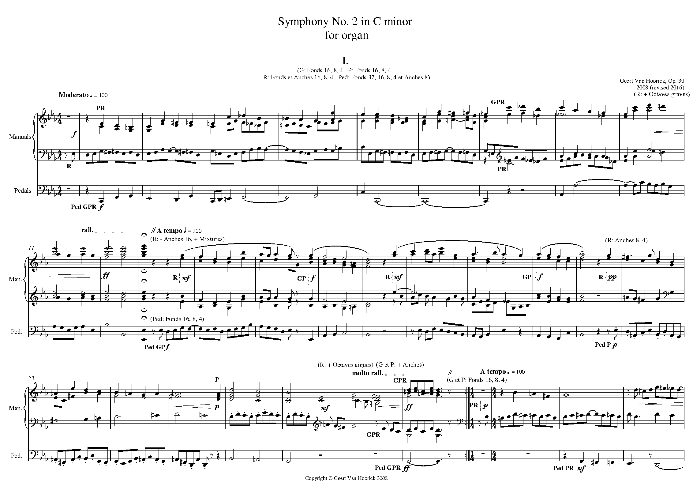 The Organ Symphony No. 2 is is neo-romantic, extrovert but profound, and consists of 5 movements. The 1st one is severe and monumental, moderately fast and in sonata form (but development section and reprise are in one). The 2nd one is very intimate and slow, in Lied form and has a religious atmosphere; two captivating and ever flowing themes can be distinguished. The 3rd one is a playful and very fast scherzo. The 4th one is mysterious and slow, a bit choral-like, and in Lied form. The 5th and final movement is vivid and fast and in sonata form; in the coda the main theme of the 1st movement returns majestically and the piece ends in a solemn way. Registration indications (based upon the Hauptwerk sound set of the Mutin / Cavaillé-Coll organ of the Notre Dame in Metz) are intended as a help and are mainly notated as in late French romantic organ music (Widor, Vierne). In 2016 I have revised the piece, checking every registration indication and every bar and I can assure now that the piece is entirely playable (the only problem may be the quick sixteenth notes in the pedals of the Scherzo) and that it will sound great if you follow my registration indications. The recording (digital performance in Sibelius 5 with Garritan Personal Orchestra, not Hauptwerk !) gives, besides the registration indications, a scant indication of the sound I want. Score moving videos on my YouTube-channel.