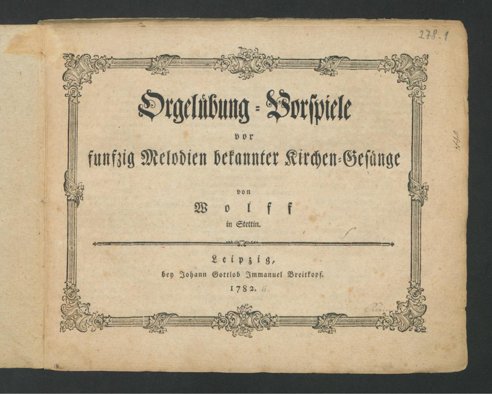 | Alternative. Title | Orgelübung-Vorspiele vor funfzig Melodien bekannter Kirchen-Gesänge von Wolff in Stettin |