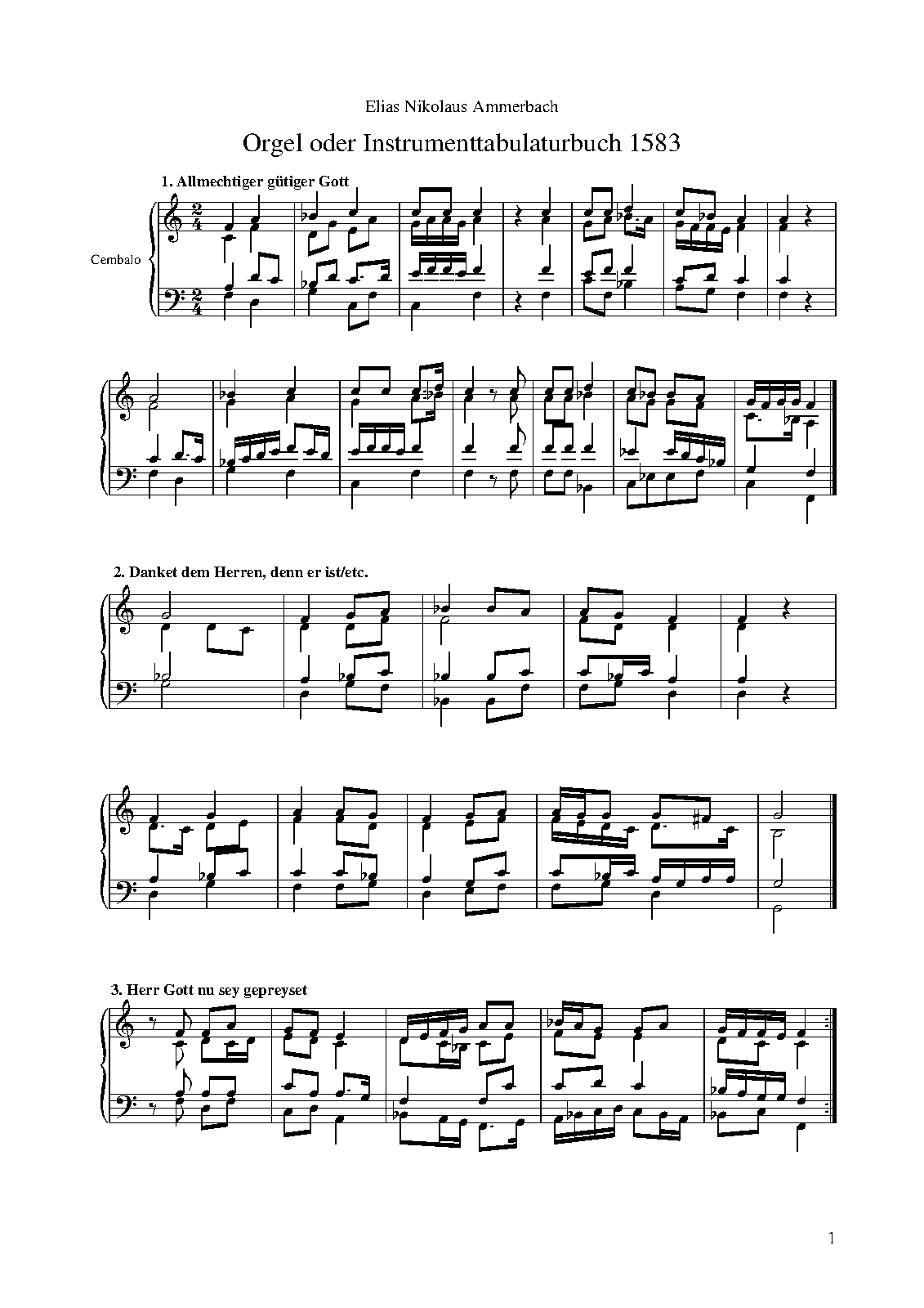 1st ed. (1571): Orgel oder Instrument Tabulatur. Ein nützlichs Büchlein / in welchem notwendige Erklerung der Orgel oder Instrument Tabulatur / sampt der Application / Auch fröliche deutsche Stücklein unnd Muteten / etliche mit Coloraturn abgefaßt / Desgleichen schöne deutsche Tentze / Galliarden unnd Welsche Passometzen zu befinden / etc. Desgleichen zuvor in offenem Druck nicht ausgangen. Jetzundt aber der Jugend und anfahenden dieser Kunst zum besten in Druck vorfertiget / Durch Eliam Nicolaum / sonst Ammerbach genandt / Organisten zu Leipzig in S. Thomas Kirchen. Mit Fleis vom Autore selbs ubersehen und corrigirt. 2nd. ed. (1583): Orgel oder Instrument Tabulaturbuch / in sich begreiffende eine notwendige unnd kurtze Anlaitung / die Tabulatur unnd Application zuverstehen / auch dieselbige aus gutem Grunde recht zu lernen. Darnach folgen auffs alerleichtest gute Deutsche / Lateinische / Welche und Frantzösische Stücklein / neben etlichen Passomezen / Galliarden / Repressen / unnd deutschen Dentzen / deßgleichen zuvor in offnem Druck nie außgangen. Jetzund aber / der Jugend und anfahenden diser Kunst zu gutem / mit Fleiß zusammen gebracht / und in Druck verfertigt / Durch Eliam Nicolaum Ammerbach / Burgern und Organisten inn Leipzig / zu S. Thomas.