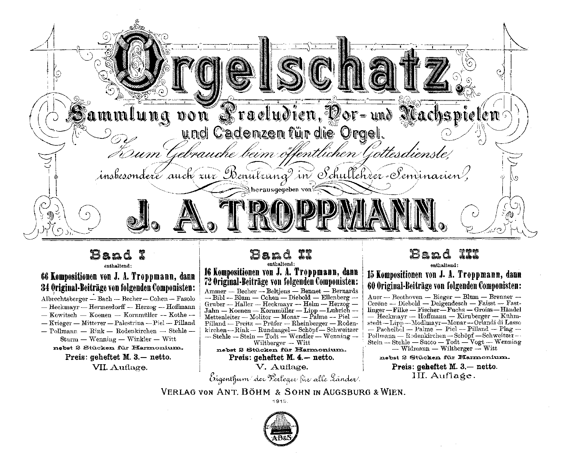 This is a collection of organ and harmonium works compiled by Johann Troppmann.