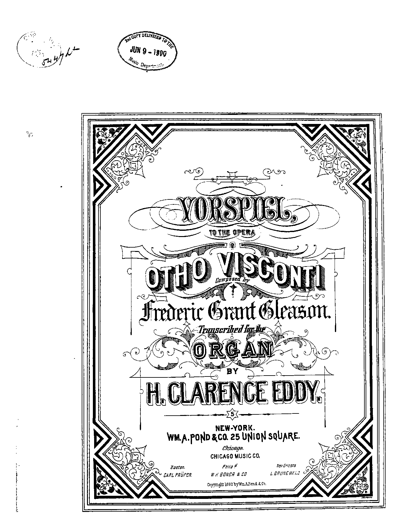 According to Elise Kuhl Kirk, American Opera (2005, U. Illinois Press), p.411 (notes to pages 123–33, note 15), the autograph vocal score to this opera is at the Frederic Grant Gleason collection of the Newberry Library, Chicago. (No mention of a full score of any kind, though. Other works she covers include Pratt's Zenobia, etc.) Also according to Kirk, Theodore Thomas conducted the prelude at the 1893 Chicago World's Columbian Exposition. (She writes that the orchestration is skillfully executed and has considerable contrapuntal interplay; whether the orchestral score of some of the work survives, or it doesn't and this is the opinion of someone who heard the work before it disappeared, is not clear, as she only specifically mentions a vocal score as being among the ms, though will check the Newberry Library catalog to see if this brings any sort of clarification. Ah. The ms full score etc. might be in the oversized bound volume "Box 13" in the Newberry collection. (Box 14 is "Old score, since revised and rewritten", also the vocal score in ms, and ballets for the opera. Box 15-16 have the 1885 opera Montezuma and its various ms., and an ode. There's also material relevant to Otho Visconti in other boxes, including the vocal score of the Serenade, Benedictine nuptiale (vocal or perhaps full score), vocal score of the introduction to Act 3, Vocal?/Instrumental? parts in box 21... etc..., Vorspiel (prelude), sketches for the opera, press material.