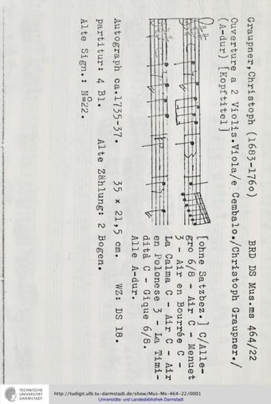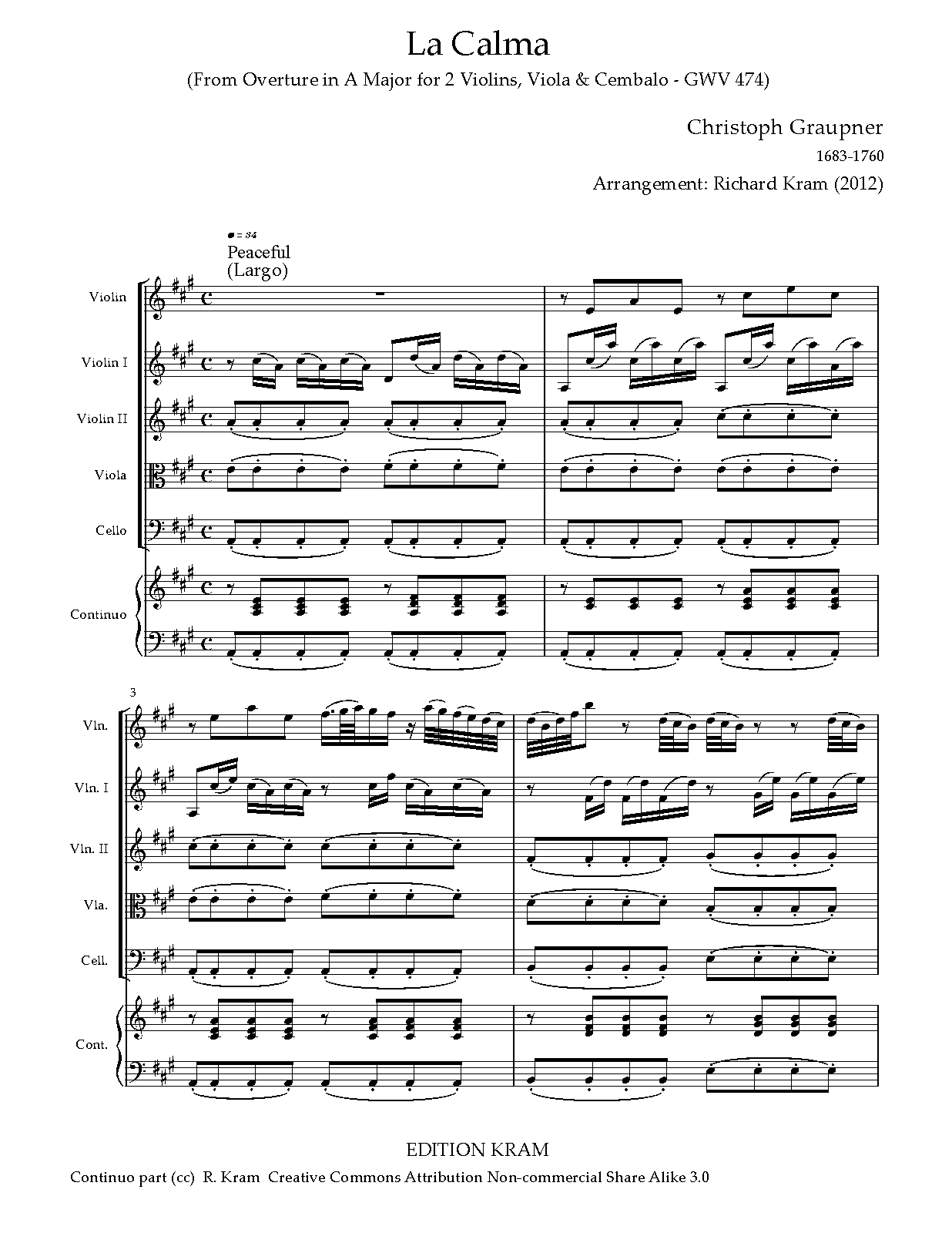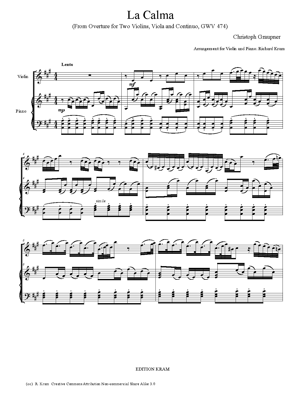 The more I play this piece, the more I love it. I'm posting two versions of "La Calma" from the Overture (GWV 474) - 1) A more or less literal transcription with realized continuo and some embellishment of the long trills in the piece that are obviously meant to be filled out and 2) An arrangement for piano and solo violin. If you want to see the original violin part without trill embellishments see the "La Calma" movement in the full score posted on the Scores and Parts tab. What other hidden treasures are lurking in the Graupner manuscripts?