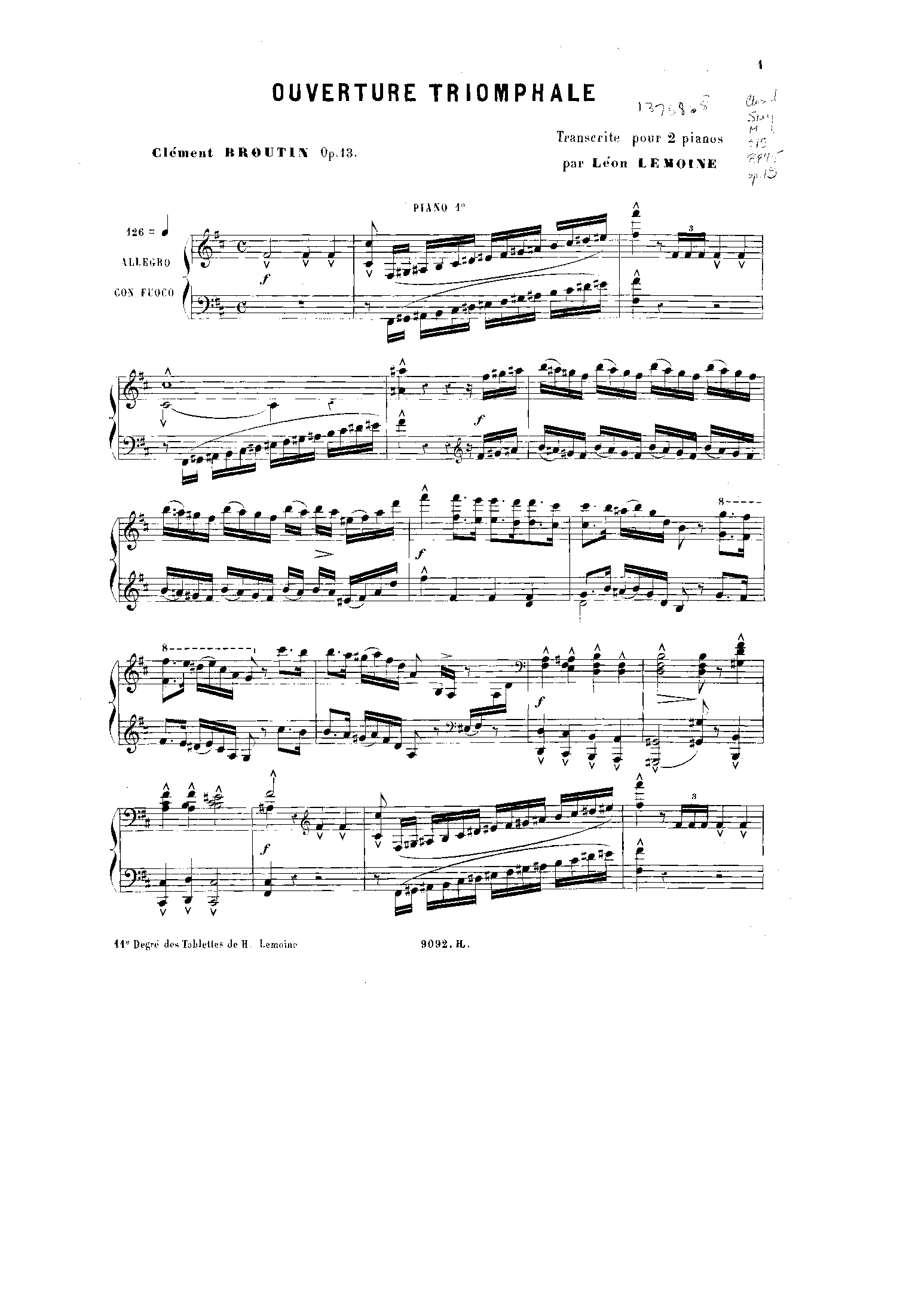 An earlier reduction for solo piano was published in 1885, as were the parts. - Publication noted in the Bibliographie de la France 2e série, 74e année, Nº 27, 4 Juillet 1885, p.388, r.2472. (reduction) ; Publication noted in the Bibliographie de la France 2e série, 74e année, Nº 23, 6 Juin 1885, p.329, r.2087. (parts)