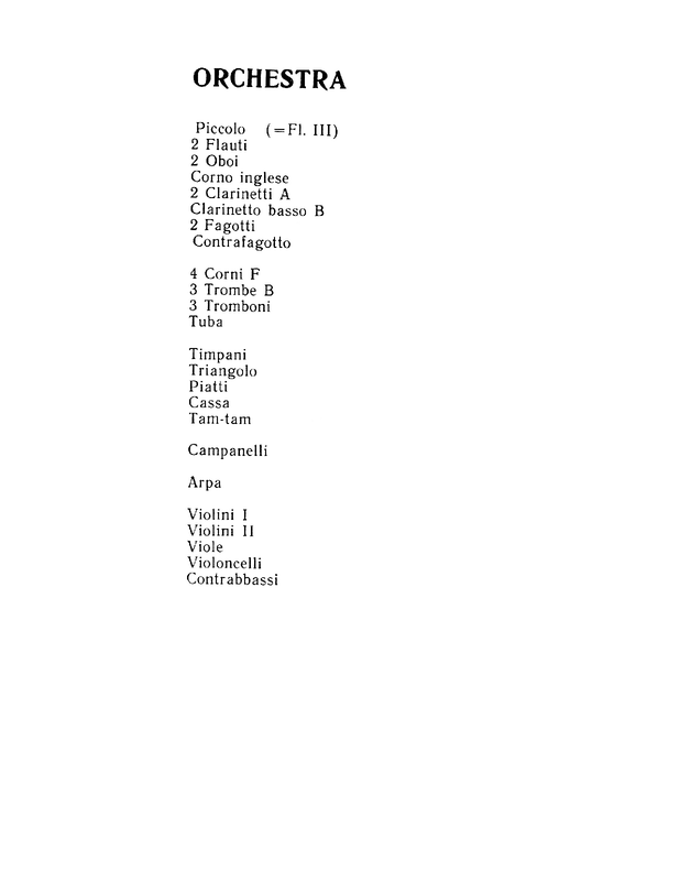 Orchestra: 3 flutes (3rd also piccolo), 2 oboes, English horn, 2 clarinets (A), bass clarinet (B♭), 2 bassoons, contrabassoon 4 horns (F), 3 trumpets (B♭), 3 trombones, tuba timpani, triangle, cymbals, bass drum, tam-tam, glockenspiel, harp, strings