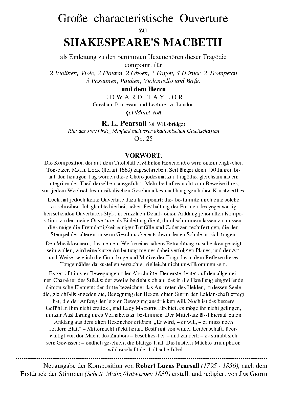 | Alternative. Title | Grosse characteristische Ouverture zu Shakespeare's Macbeth als Einleitung zu den berühmten Hexenchören in dieser Tragödie componirt für 2 Violinen, Viole, 2 Flauten, 2 Oboen, 2 Clarinetten, 2 Fagott, 4 Hörner, 2 Trompeten, 3 Posaunen, Pauken, Violoncello und Basso |