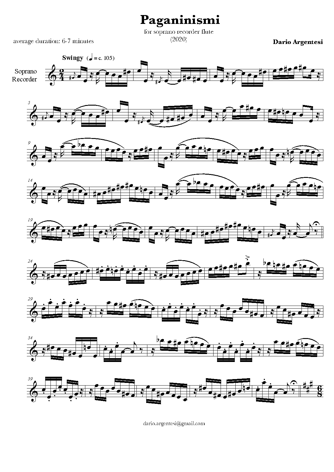 A set of modern variations based on Paganini's 24th Caprice. The performer is allowed to change the order of the variations if so desires. The set is meant to be performed somewhat liberamente, conveying a sort of improvisational character, adding embellishments con gusto. But, well, if you simply follow the text, believe me it's fine.