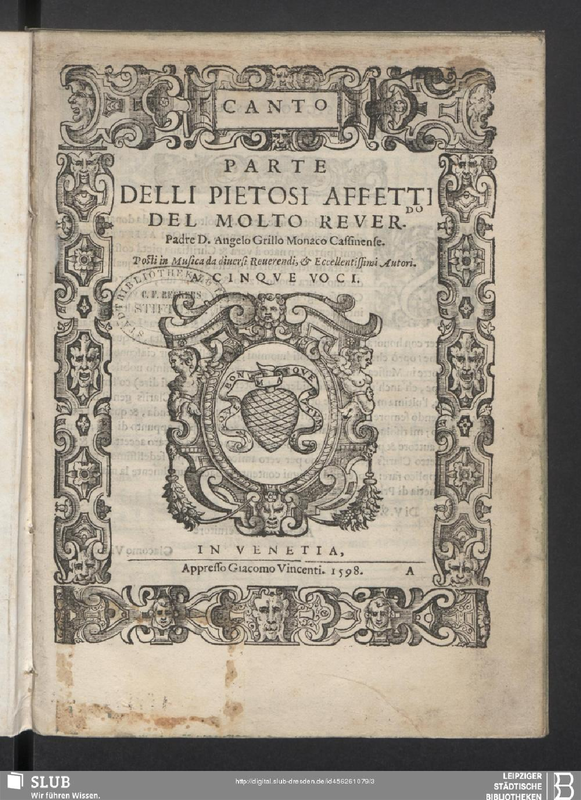 | Alternative. Title | Parte delli Pietosi Affetti del molto reverdo. Padre D. Angelo Grillo Monaco Cassinense. Posti in Musica da diversi Reverendi, & Eccellentissimi Autori a cinque voci |