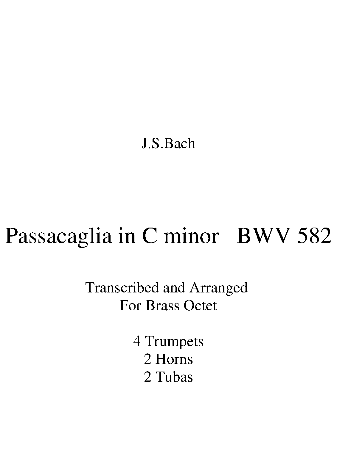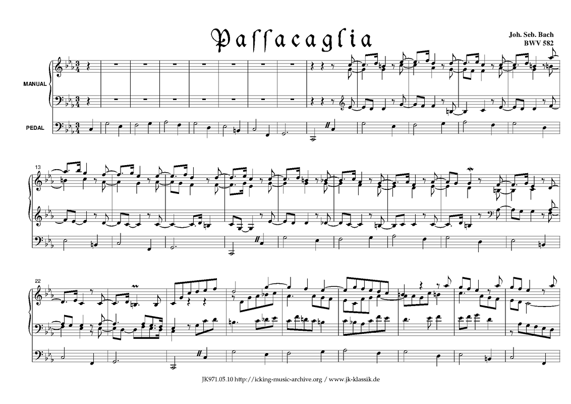 Name Aliases Pasakljo c-minora; BC J79; Passacaglia c mol; Passacaglia a fúga c mol, BWV 582; BWV582; Passacaille et fugue en do mineur BWV 582; Passacaglia e fuga in do minore; Passacaglia und Fuga c-moll; Passacaglia and Fugue in C minor