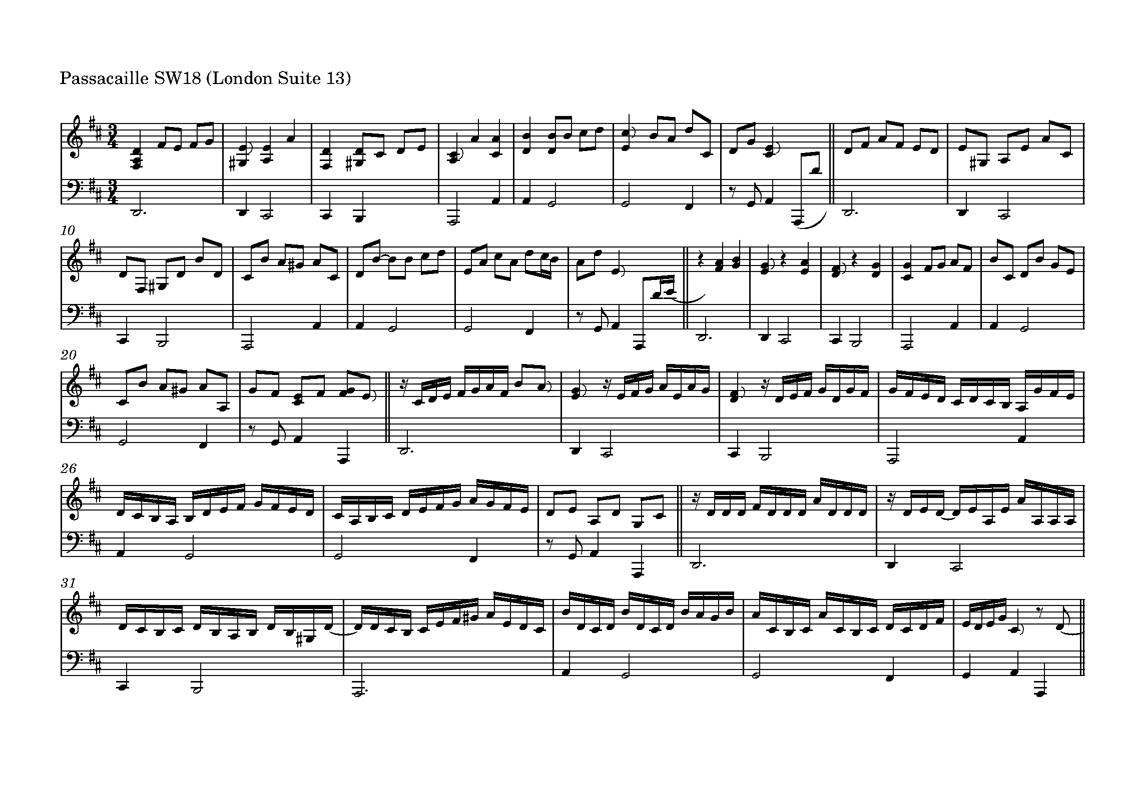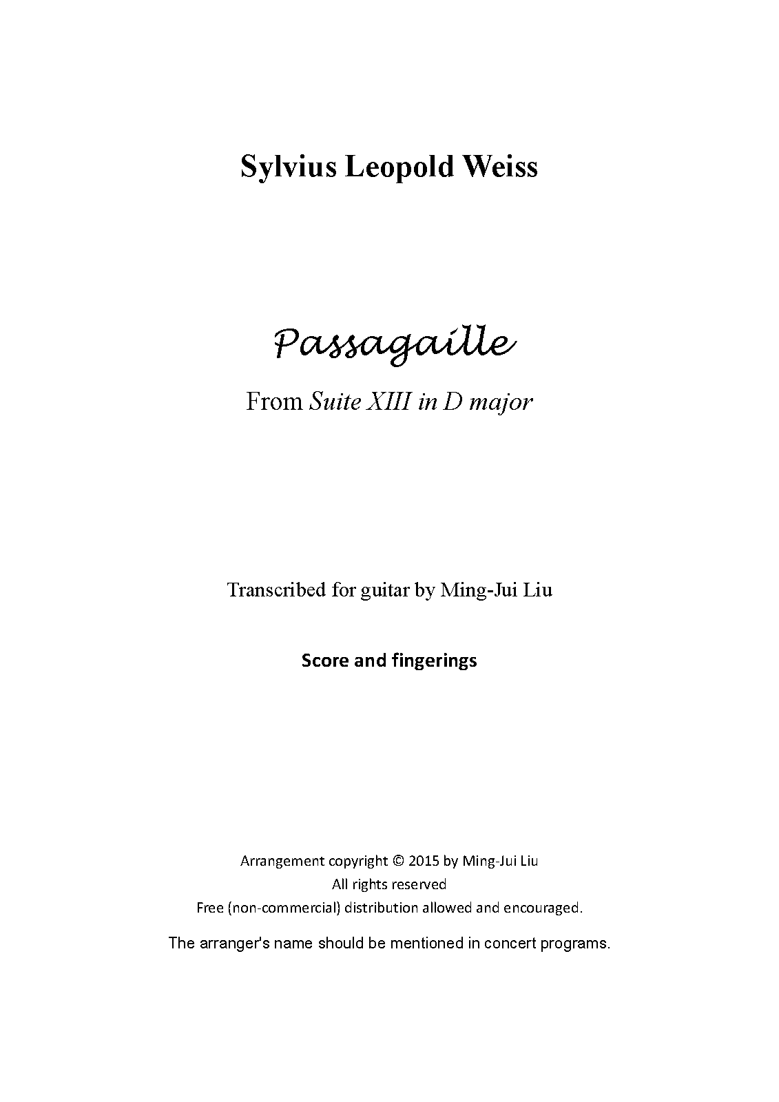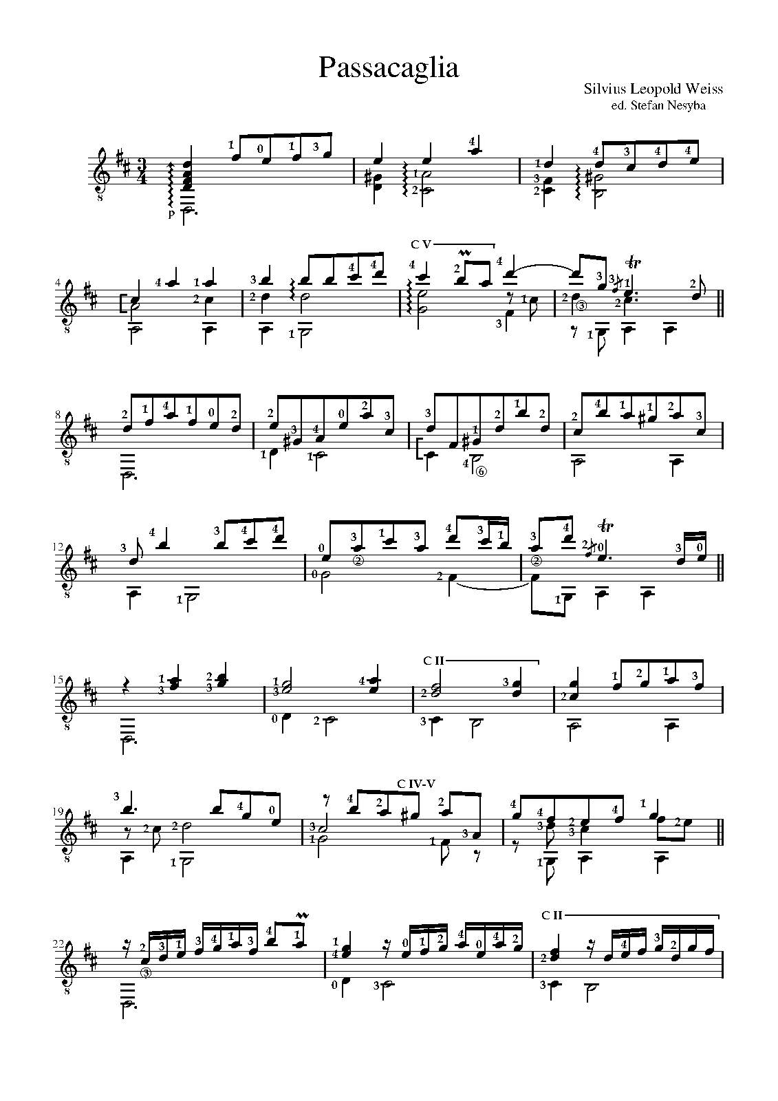 | Extra Information | Level: Advanced; Catalogue: EL47. Possibly the finale of a suite in D (WeissSW 18.1 --> WeissSW 18.6 - Allemande/Courante/Angloise/Sarabande/Menuet/Passacaglia (Sm104–109) ?) Labeling, identification, etc. from slweiss.de Worklist. Manuscripts (of passacaglia) at British Library (87v in the "Manuscript of London", GB-Lbl Ms. Add. 30387, which contains 238 Weiss works in all) and work no.73 (likewise not Weiss work no.73, just work no.73) in "GB-HAdolmetsch Ms. II.B.2" which has 53 works by Weiss. |
