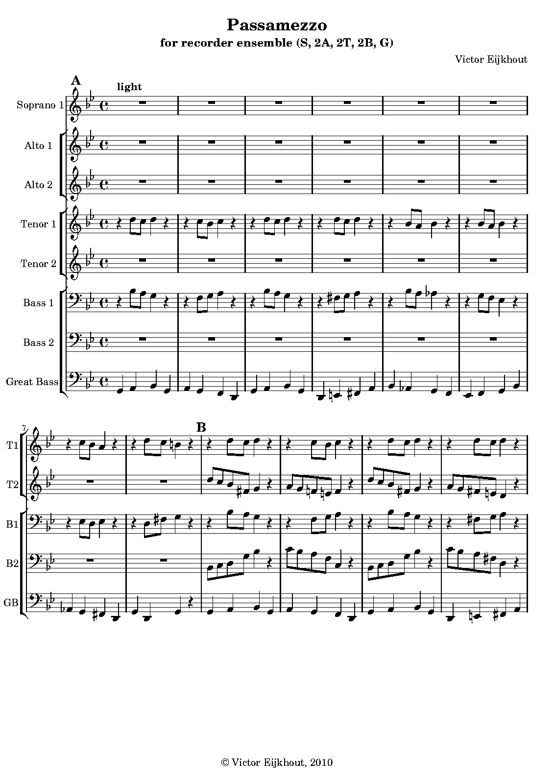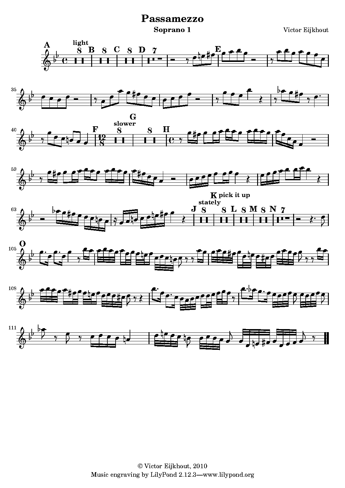 This composition consists of 14 variations of the Passamezzo bass, divided in four sections. With the exception of the short 3rd section, in the style of a French overture, all sections build up gradually, and end with a variation that has a virtuoso soprano part. For the rest there are no sopranos to be found in this piece.