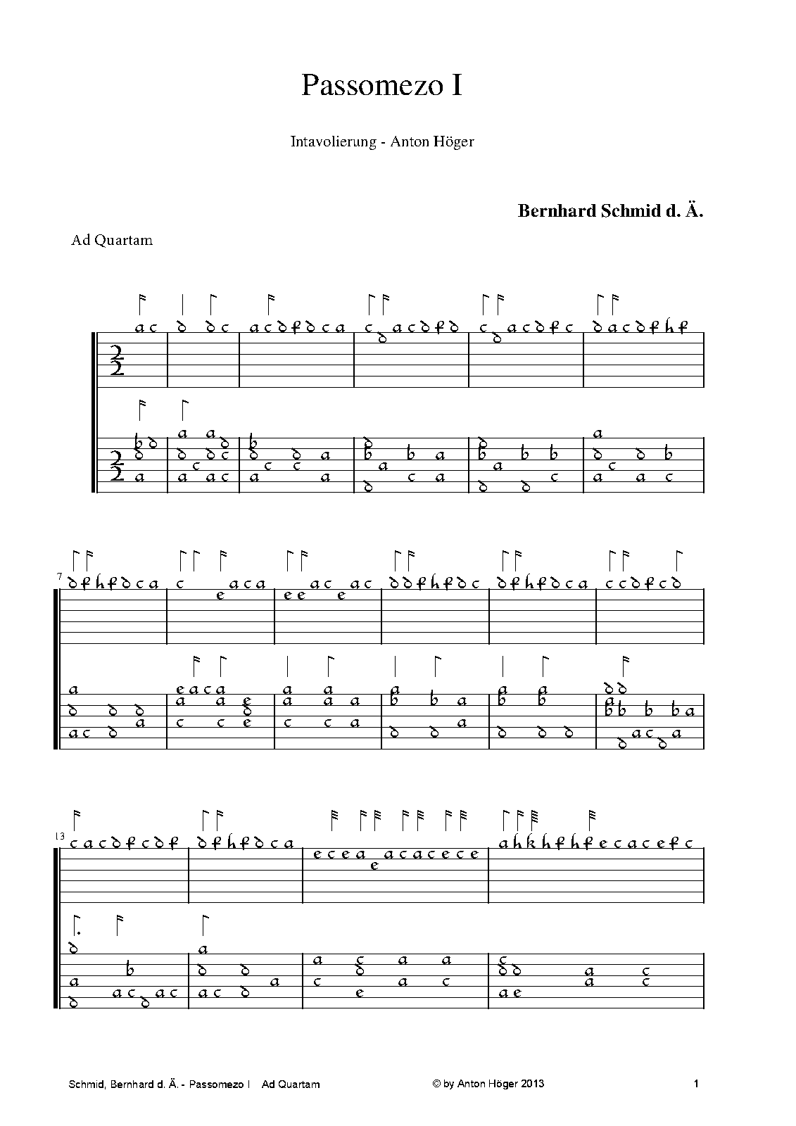This piece is from the collection Einer Neuen Kunstlichen Tabulatur . . . allen Organisten und angehenden Instrumentisten zu nutz. Grove Music comments: "As the full title indicates, Schmid intended his book for all kinds of keyboard instruments. The book serves as an index of the type of keyboard music performed at that time in church and in the home."