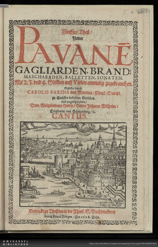 Fünffter Theil, Newer Pavane[n] Gagliarden, Brand: Mascharaden, Balletten, Sonaten. Mit 2. 3. vnd 4. Stimmen auff Violen anmutig zugebrauchen