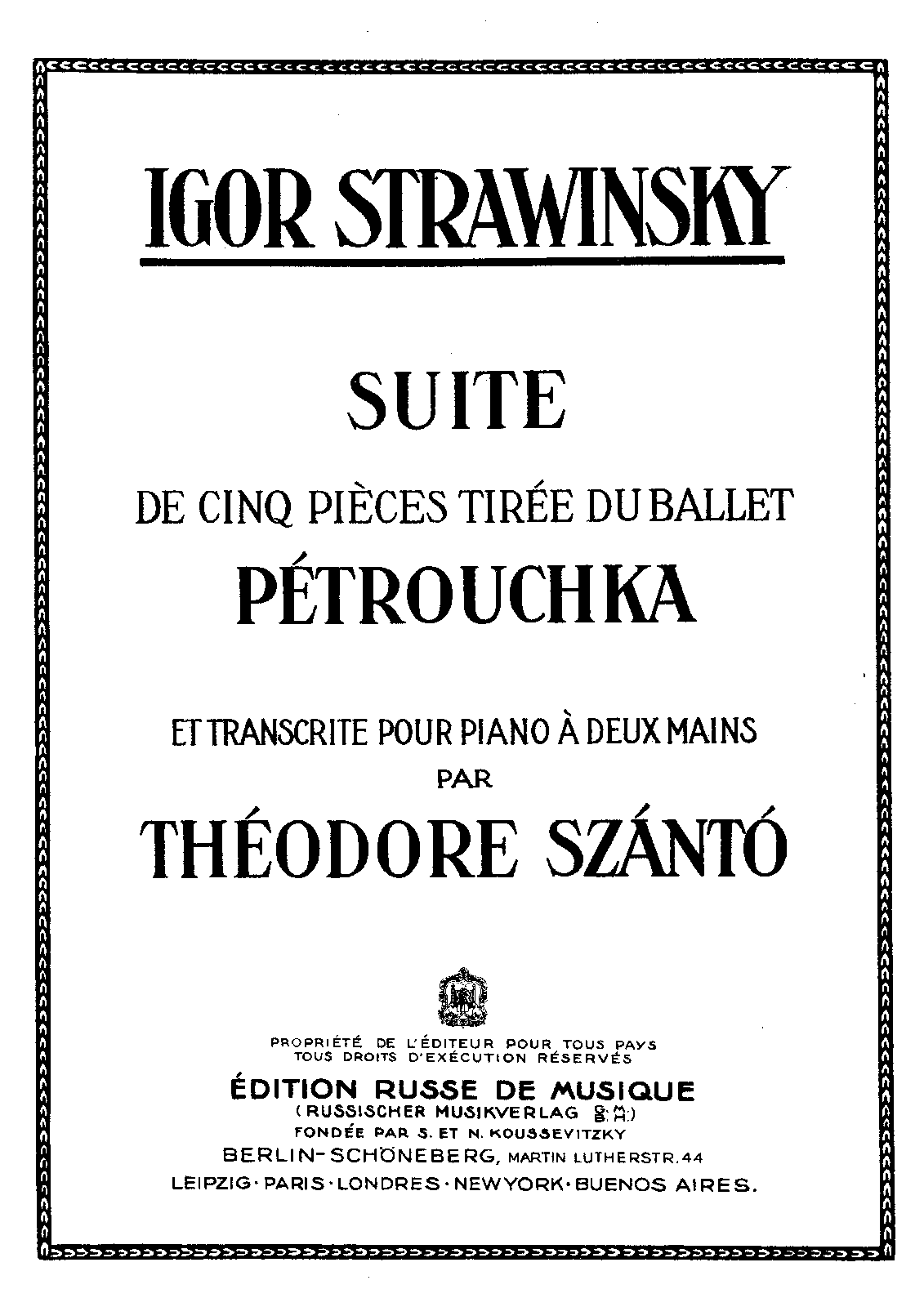 | External Links | Kirchmeyer Catalog Wikipedia article Trois mouvements de Petrouchka (Wikipedia article) Scores at Sheet Music Plus |
