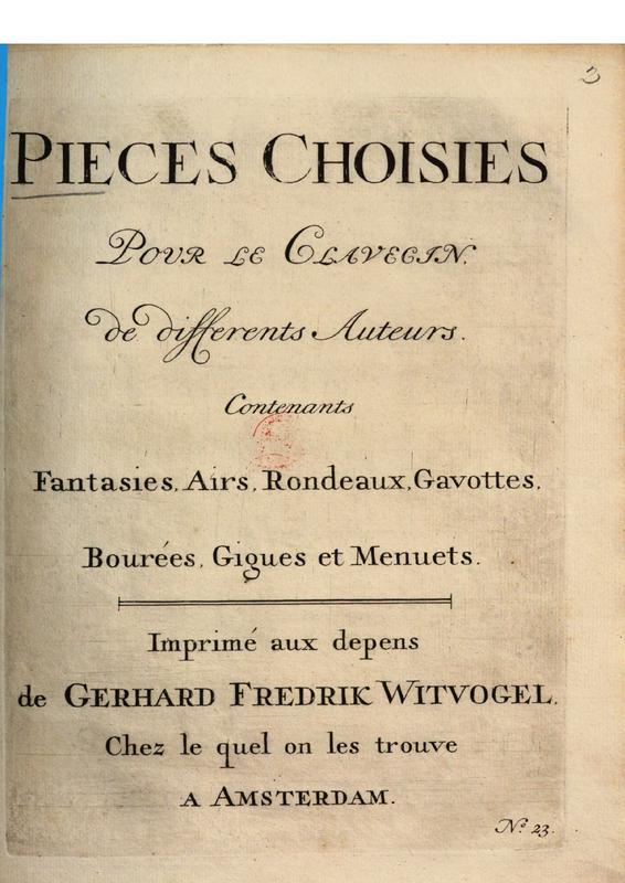 | Alternative. Title | Pièces Choisies Pour le Clavecin de differents Auteurs. Contenants Fantasies, Airs, Rondeaux, Gavottes, Bourees, Gigues et Menuets. |