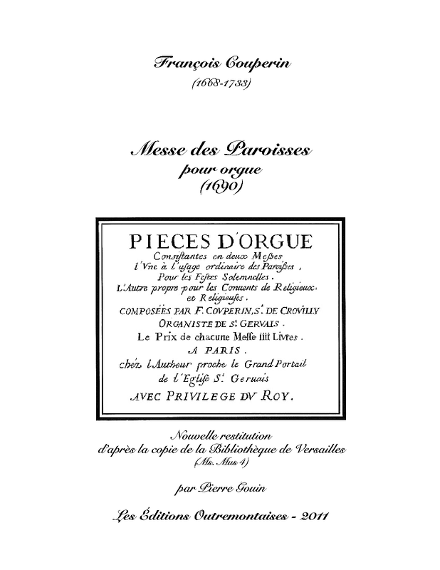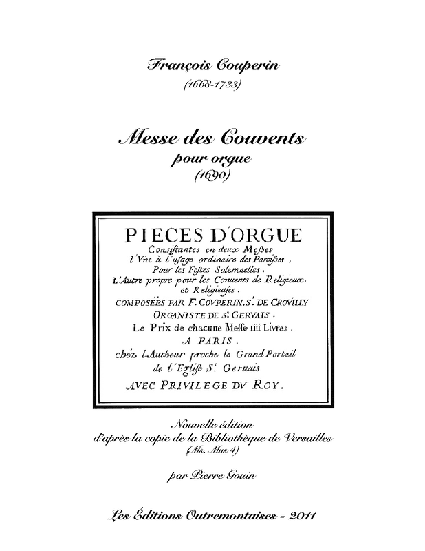 | Alternative. Title | Pièces d'Orgue consistantes en deux Messes, l'une à l'usage ordinaire des Paroisses, pour les Festes Solemnelles. L'autre pour les Convents de Religieux et Religieuses. |