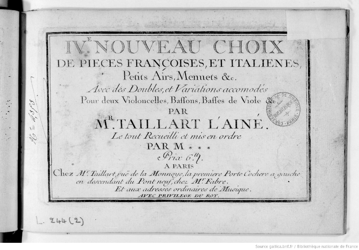 | Alternative. Title | IVe. Nouveau choix de pièces françoises et italienes, petits airs, menuets &c. avec des doubles et variations, accomodes pour deux violoncelles, bassons, basses de viole &c. |