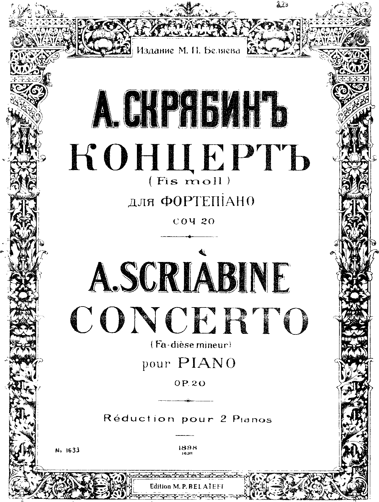 | Name Aliases | Piano Concerto in F sharp minor; Klavierkonzert fis-Moll; Klavierkonzert in fis-Moll; Pianoconcert (Skrjabin) |