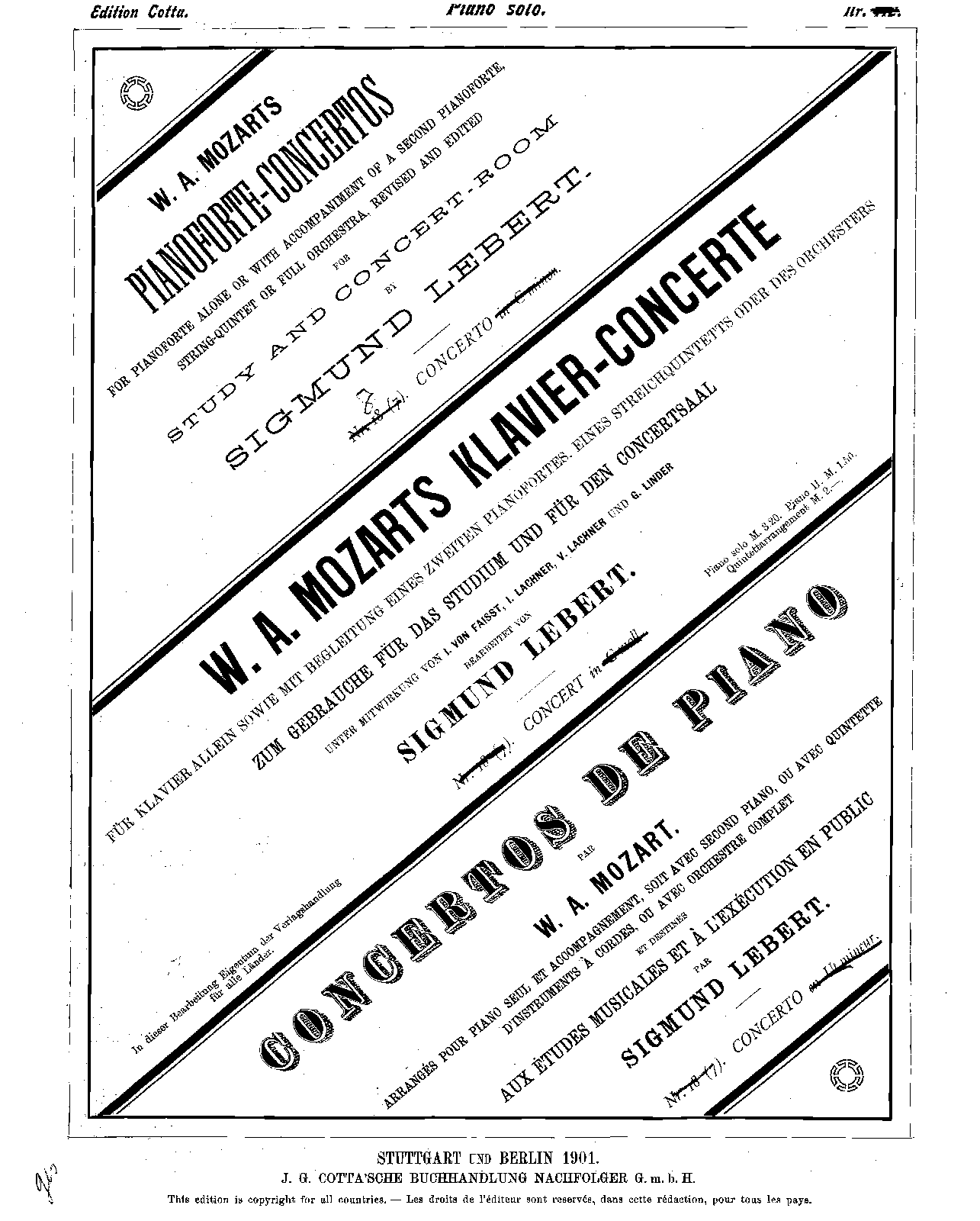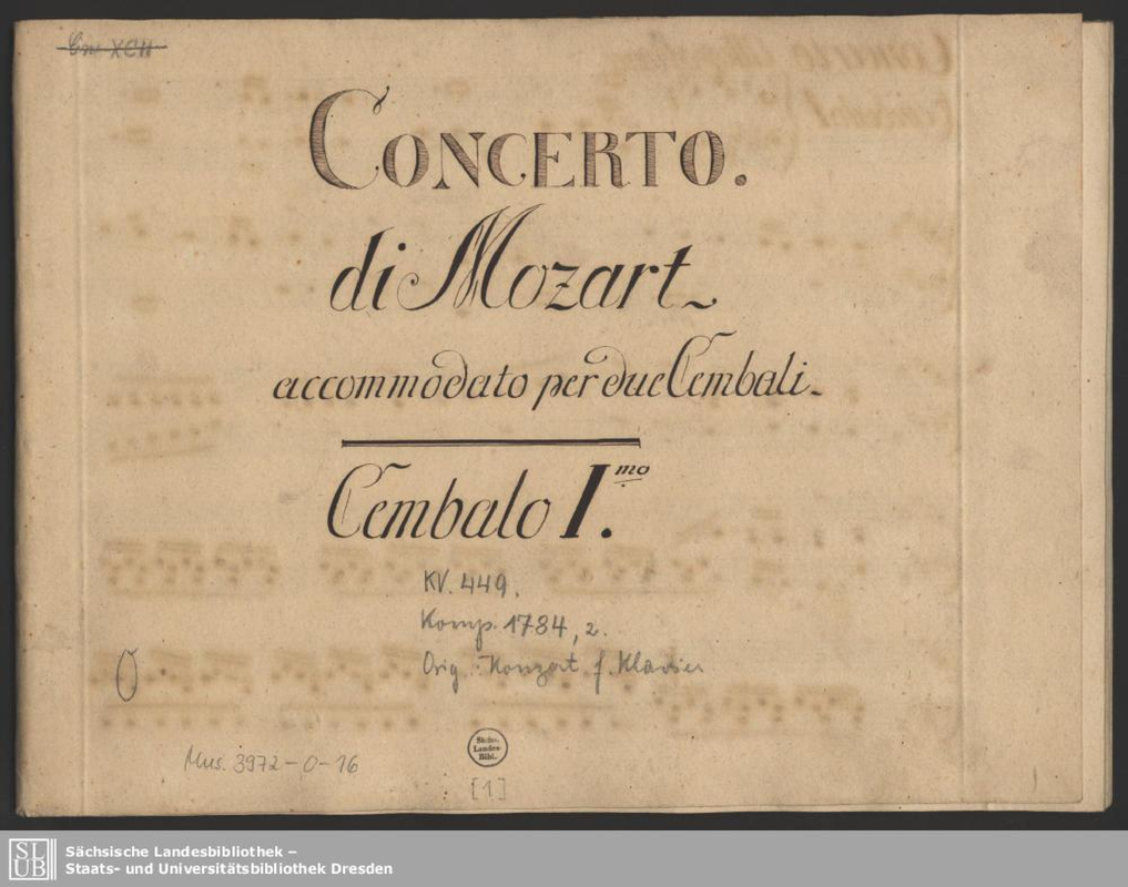 | Extra Information | For first edition parts see e.g. WorldCat. Possibly(?) among the 20 Piano Concertos by Mozart prepared in full score by Henri Roubier published by Richault in 1858 (for some of his piano concertos, e.g. KV 537 (no.26 in D), this was their first appearance in full score (partition/partitur) as against separate instrumental parts or arrangements.) |