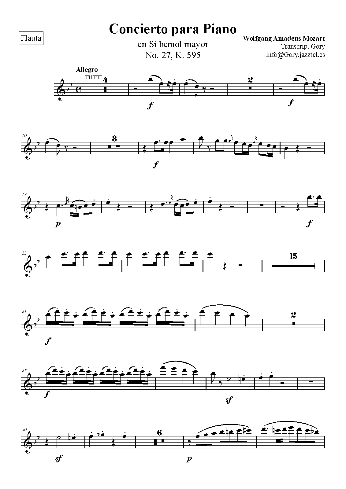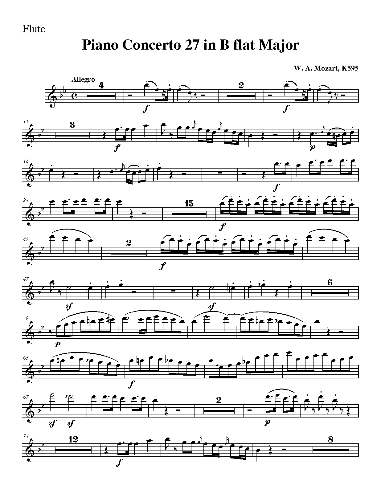 Name Aliases Piano Concerto No. 27 (Mozart); K 595; Klavierkonzert Nr. 27; Klavierkonzert B-Dur; Klavierkonzert in B-Dur; KV 595; Pianoconcert nr. 27 (Mozart); B-dúr zongoraverseny K. 595