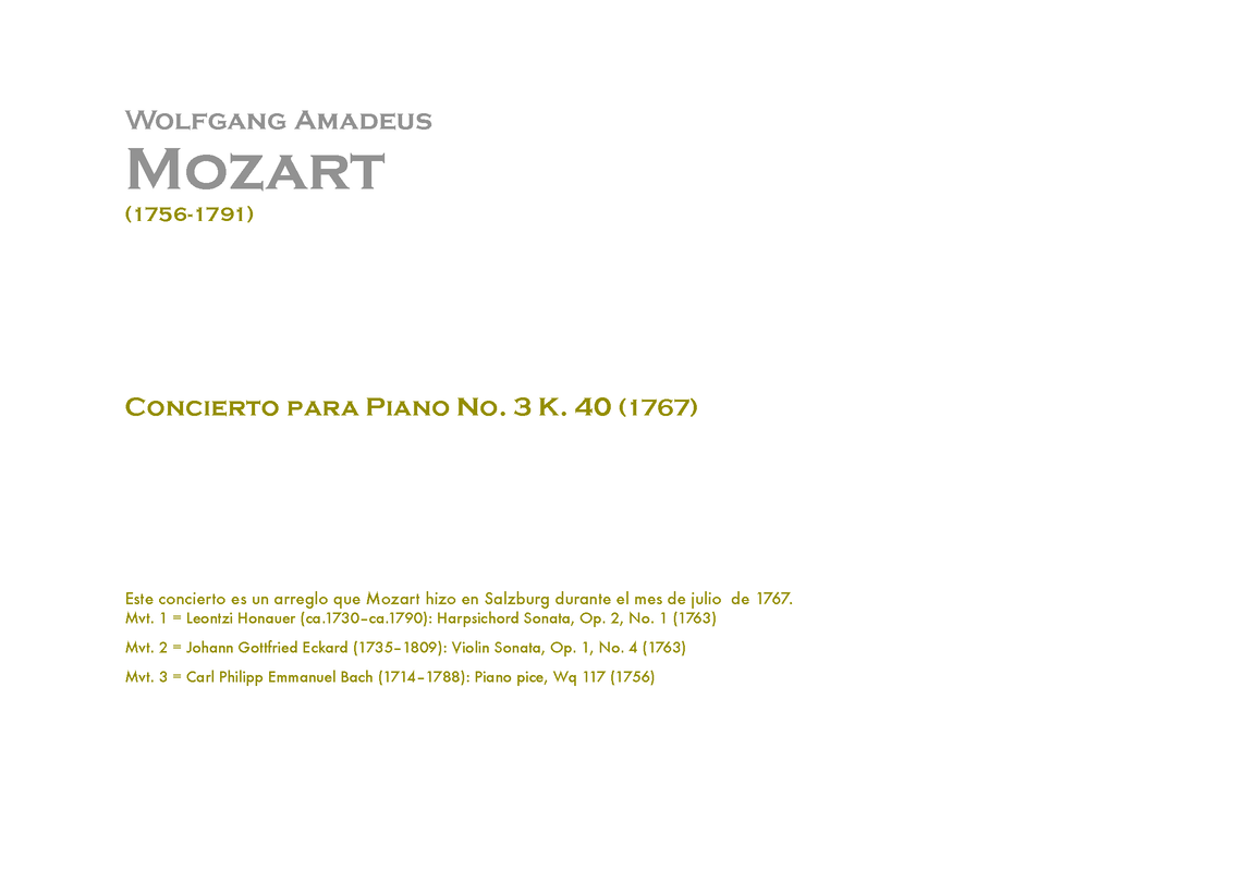 | Name Aliases | III Koncert fortepianowy D-dur; K. 40; II Koncert fortepianowy (KV 40); K 40; Concerto per pianoforte n. 3 (Mozart); |