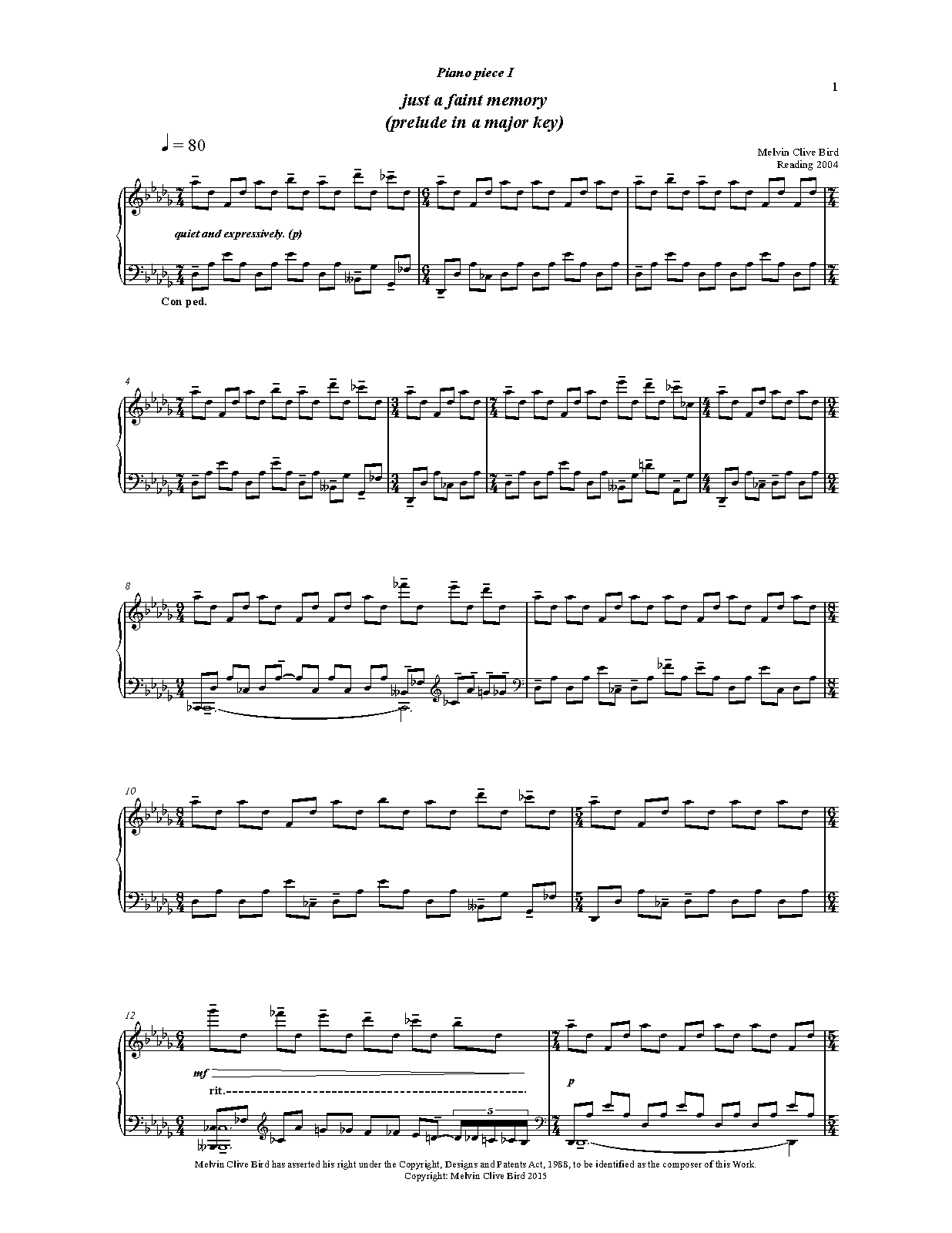 Melvin Bird has asserted his right under the Copyright, Designs and Patents Act, 1988, to be identified as the composer of this work. Please contact the composer for further information. The composer welcomes any performances and recordings. melvin.bird@hotmail.com. A clear and clean text.