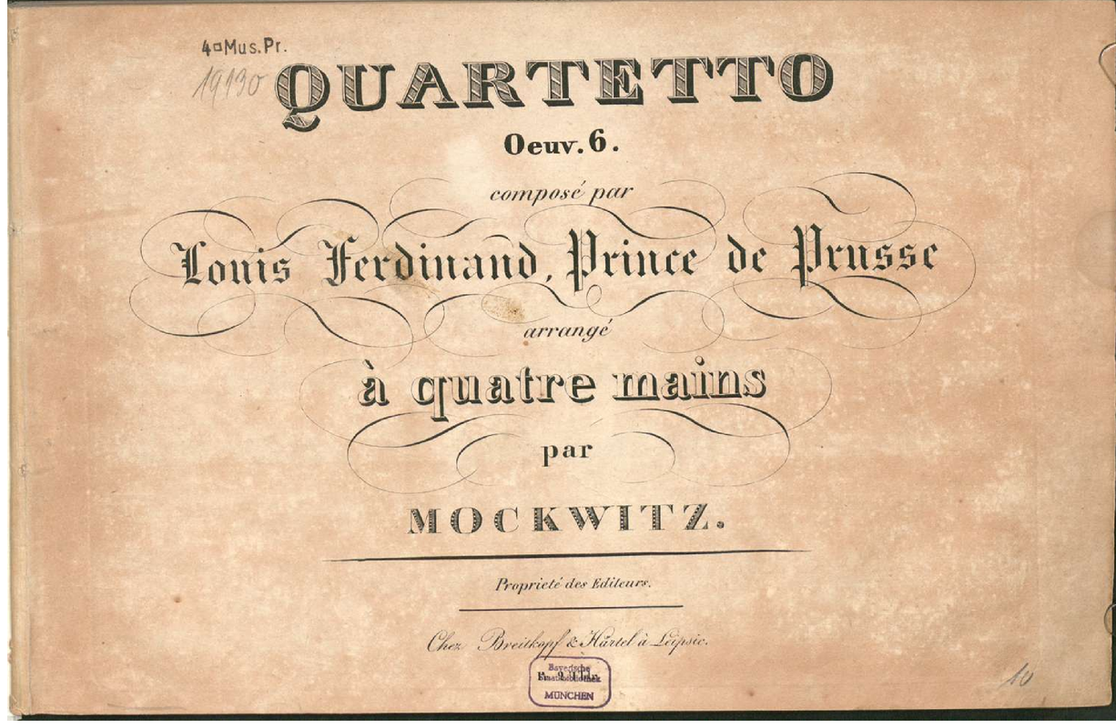 Misc. Notes Accompagnement du Quatuor de Louis Ferdinand Prince de Prusse. Oeuvre 6. Arrangé pour un Second Piano à l'usage de Madame le Comtesse de Mejan, née Baronne de Spielmann, par Andre Streicher.