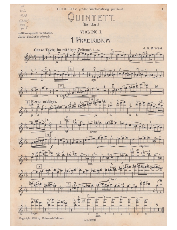 Violino I part has "in" Zeitmaß (beginning of Intermezzo); Violoncell has "im" Zeitmaß. There are discrepancies of small kinds between the string parts and the piano parts. - Schissel (Not sure of premiere date, but performed in Bremen sometime in late 1912, according to the January 1, 1913 Musical Times and Singing Class Circular, p.52. Perhaps earlier, as it had been in print for two years.) Piano part has
