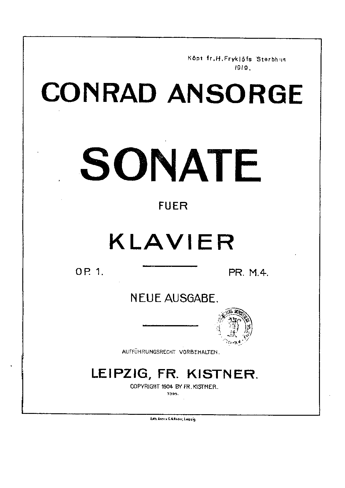 #11337: This file is from the MIT archive project. Presumably?? (possibly not?) the same sonata in F minor published without opus number in 1884 by Leipzig: Licht & Meyer and hence, not a first edition. (Since his opus 3 dates from the 1880s, it would be surprising if his opus 1 awaited 1904 for first publication, anyway.) (In fact, in the Hofmeister Verzeichnis der im Jahre erschienenen Musikalien of 1904, this is listed as a New Edition of the work- a revised edition, not the first.)